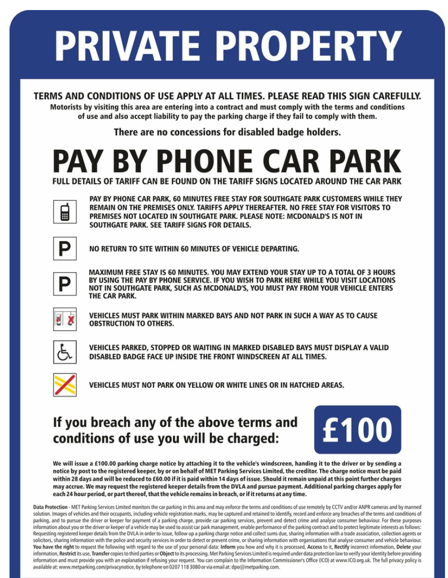 The dispute concerns signage and boundary clarity at a location referred to as "Southgate Park," which includes Costa and McDonald's premises. The lack of clear demarcation between car parks creates confusion, especially in low-light conditions. On the date in question, we parked believing it was a shared retail car park. Costa was closed, and we departed within 30 minutes and 7 seconds. However, CCTV footage was used to allege an overstay in a "free" car park that was not actually free at the time.