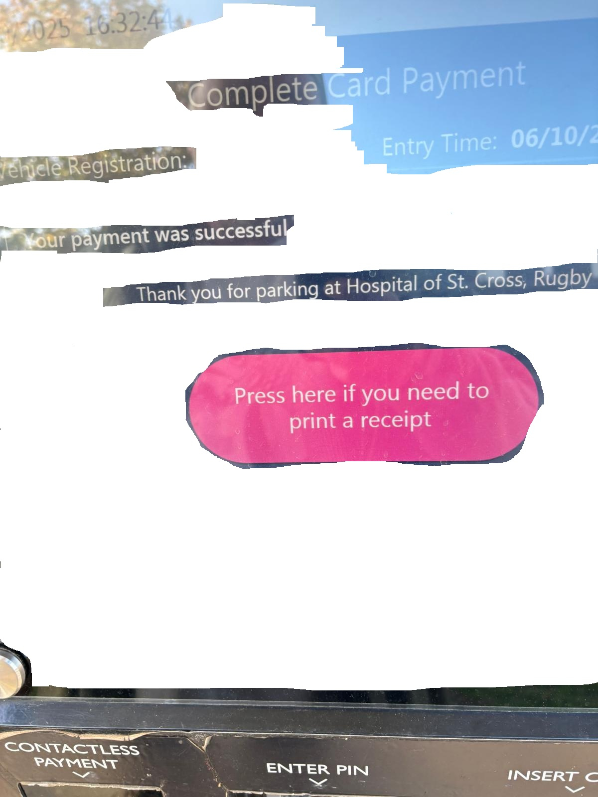 Email sent:With reference to your invoice no. above I am the keeper of the vehicle xxx xxx. However I was not the driver on the day that you claim a contravention took place. I only have a provisional licence and as you can clearly see in your photographs there are no L plates on the vehicle. I did not drive my car on that day.A relative borrowed the car to go to a hospital appointment and following a long consultation with a consultant where they were given a lot of complicated information to digest they absent-mindedly put the wrong registration in to your machine. A machine that they could barely read because of the awful glare of the sun off the screen.They did, however, pay for the parking for the relevant period as evidenced by one of the photographs that they took of the screen as a receipt. (Attached.)