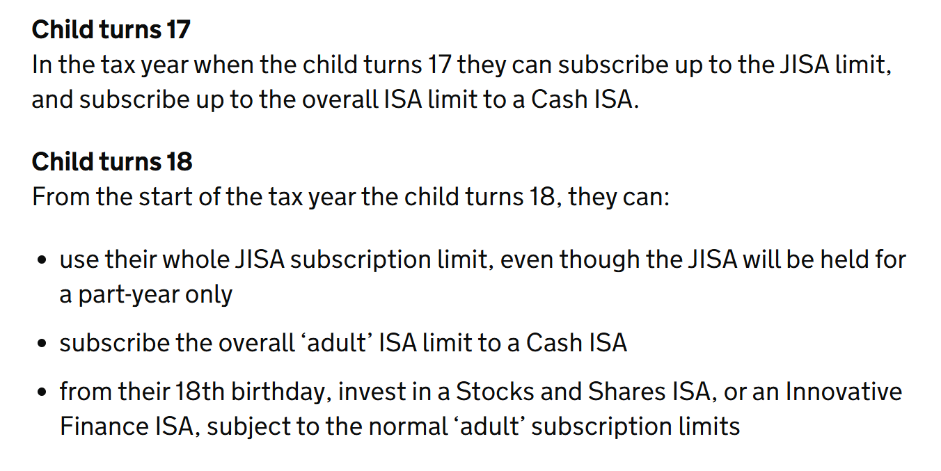 - Stocks and Shares ISA: They cannot open an adult Stocks and Shares ISA until they are 18.