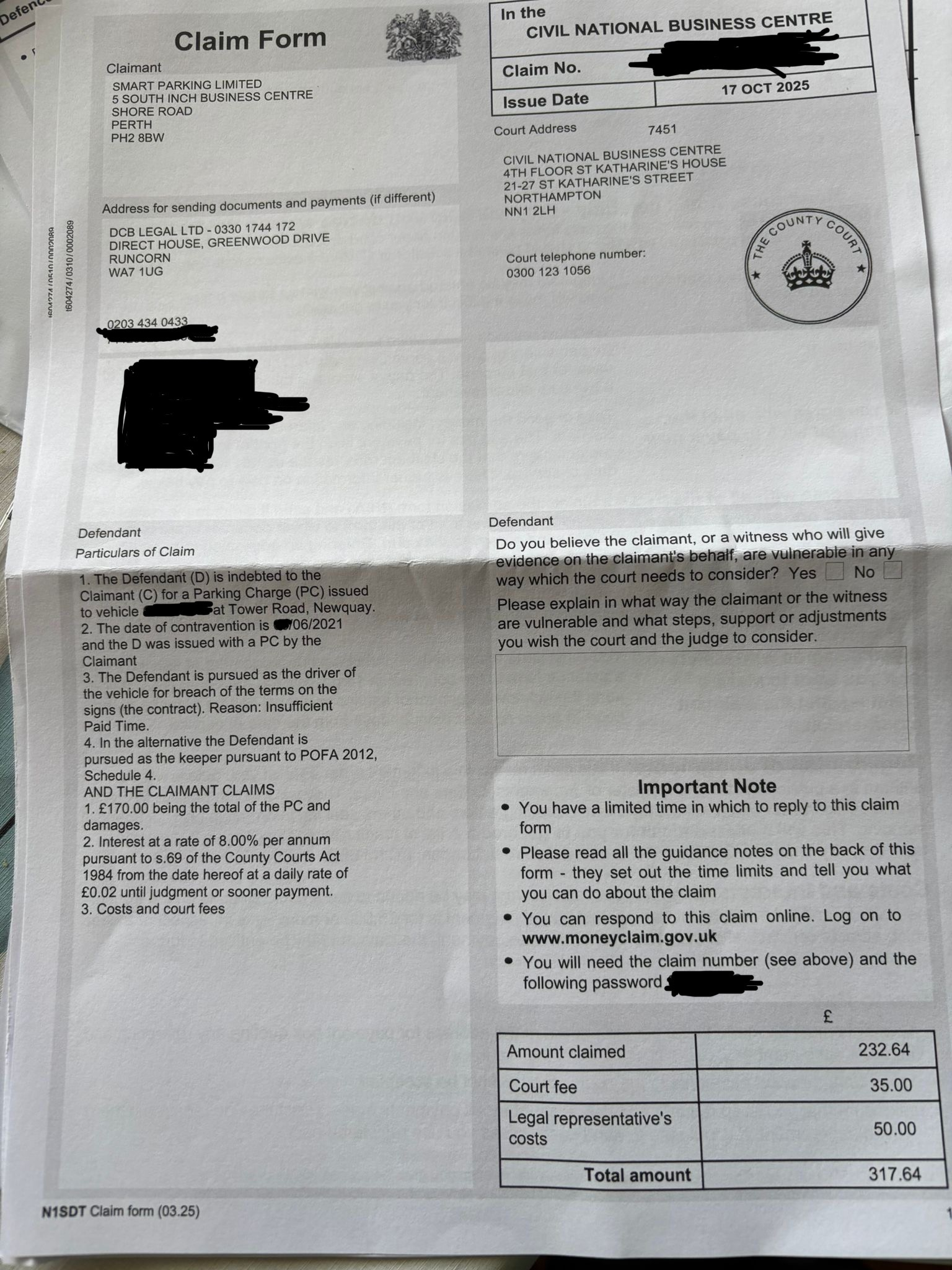 This arrived the other day. The MCOL website would not recognise the claim number or password so the registered keeper of the vehicle contacted the court who sent out the details of how to respond via email. An AoS has been submitted via email today. The claim will be defended in full.