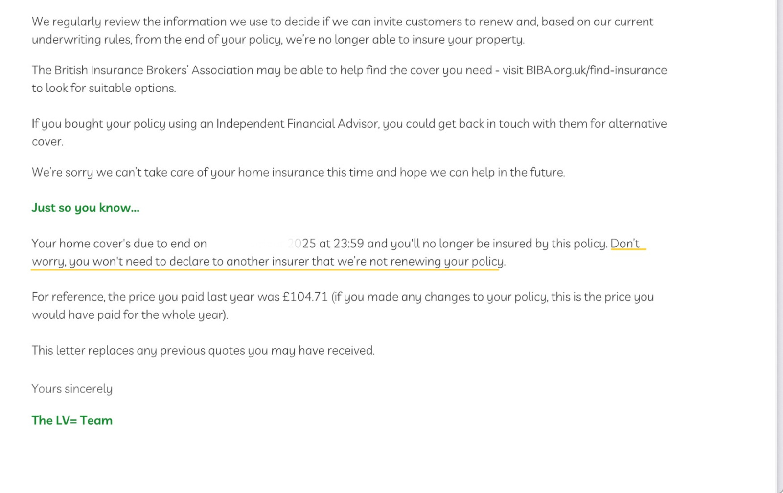 They don’t give a reason but I remember some years back, they stopped offering insurance for those with oil heating, which I have. It could be something to do with that. What’s confusing me is that every insurer will ask ‘Have you ever had insurance denied, cancelled or declined on renewal?’, so why are LV stating that I don’t need to declare this?