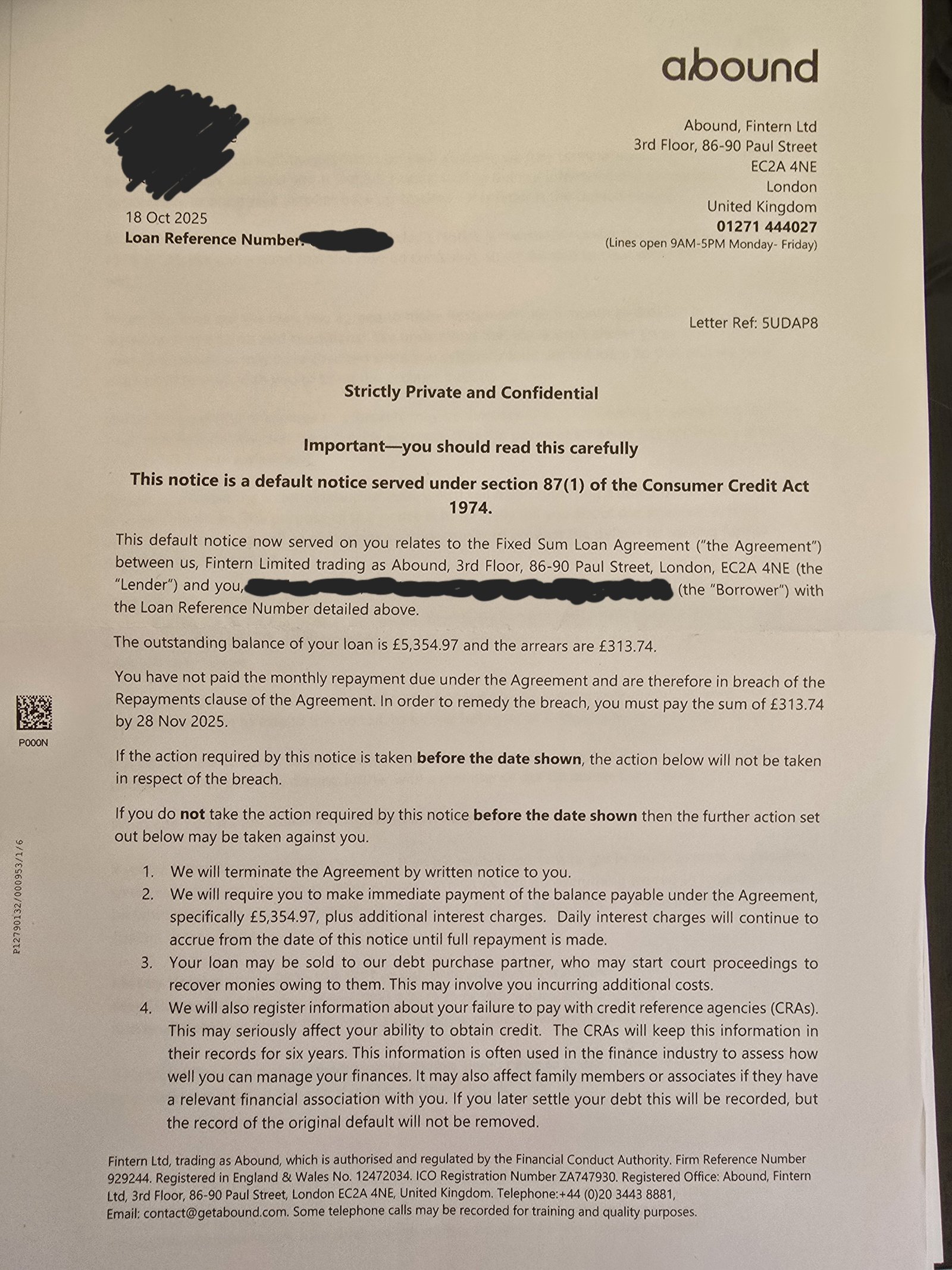 Hi all, have been reading a lot of great advice on here last couple months. I've just started facing my debt repayment journey and after reading advice on here have stopped paying and have been ignoring my 3 creditors (2 unsecured loans (Abound & Lloyds Bank & 1 Zopa credit card) with debt totalling around £10k. One of my creditors, Abound By Fintern, has just sent me this letter today. My question is: is this an actual default notice? One of the reasons for asking is that I've only missed 2 payments so far and it's not even been 3 months so seems a little quick for them to default me?