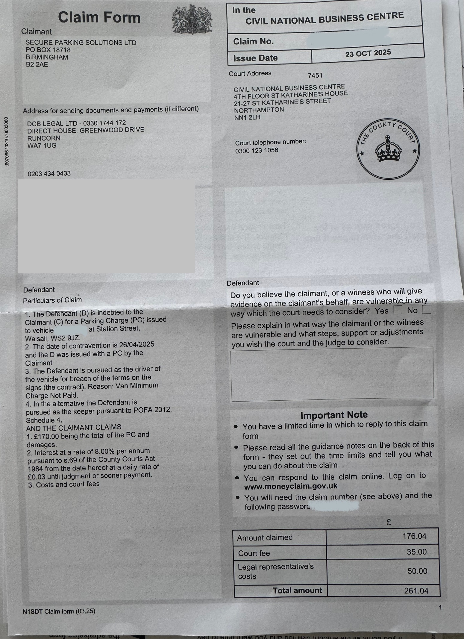 I’ve just received a claim form from DCB Legal on behalf of secure parking solutions. Long story short a van that belongs to me which is used solely for business was parked in a pay and display, but didn’t pay the minimum van charge, instead paid the car fee. I have been back to this car park and there are huge signs hung high and on every entrance stating £2.50 all day parking, which was paid and ticket displayed in the windscreen. Only looking at the small print on the sign next to the pay machine it states the van minimum charge is £5.50… very misleading and easy to get caught out and likely a genuine mistake bearing in mind a ticket was bought.