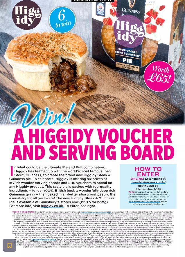 The prize is a £30 voucher to spend on any Higgidy products and a Higgidy serving board, worth £35. Six winners will be randomly selected from the entries received.