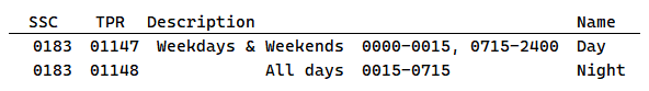 Thanks. If I haven't gone cross-eyed, and adding in the zeroes that sometimes get dropped, we have PC 02, MTC 038 and LLFC 30. That brings up just one entry (out of 300,000 in my big table!) showing that the SSC ('Standard Settlement Configuration') is 0183, giving these timings (called 'Time Pattern Regimes', TPR):pattymac33 said:For Ildhund the numbers are: 2. 38. 30