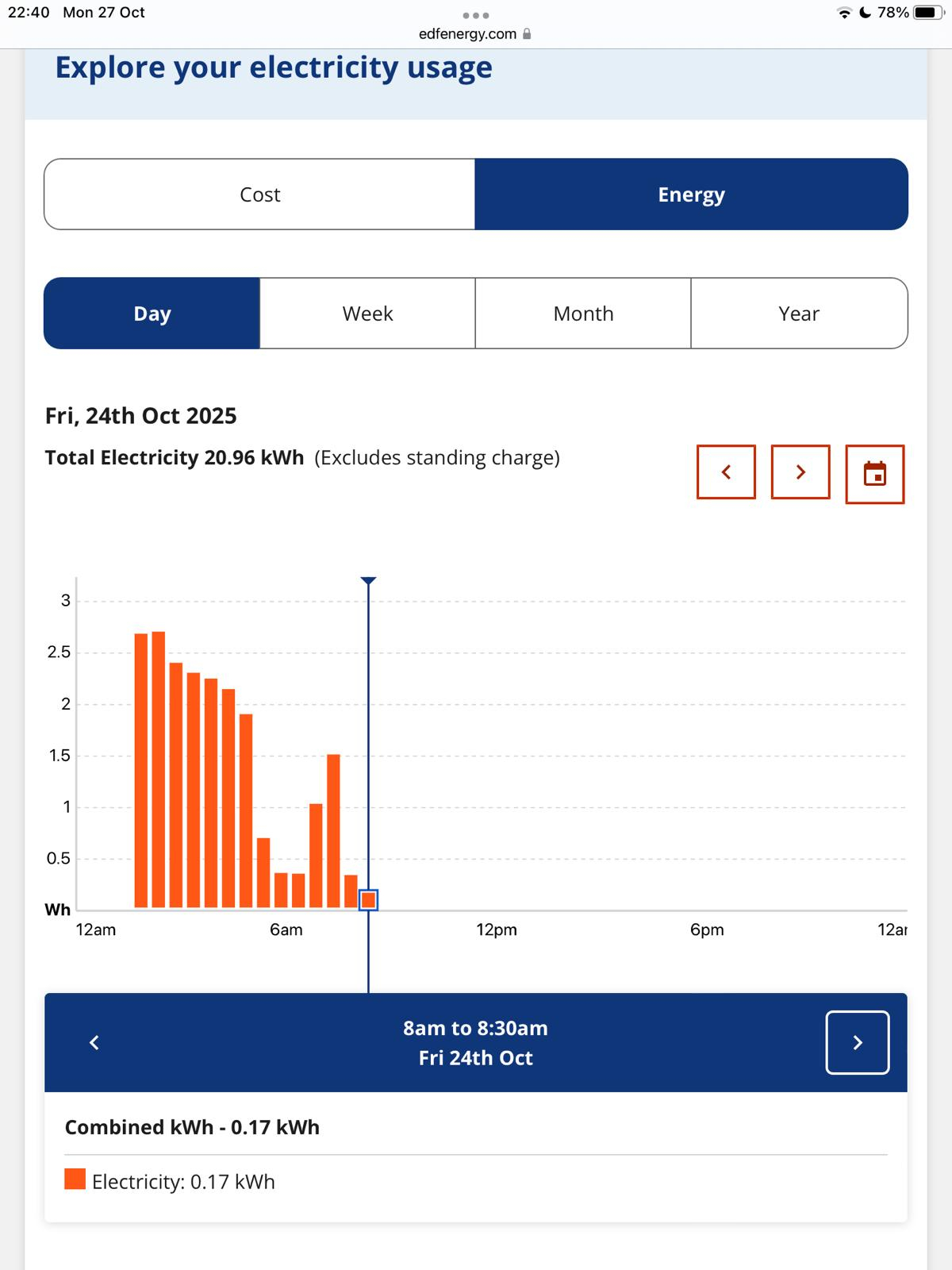 What does the "day" chart look like for Fri 24th? Can you share a photo?N. Hampshire, he/him. Octopus Intelligent Go elec & Tracker gas / Vodafone BB / iD mobile. Ripple Kirk Hill Coop member.Ofgem cap table, Ofgem cap explainer. Economy 7 cap explainer. Gas vs E7 vs peak elec heating costs, Best kettle!