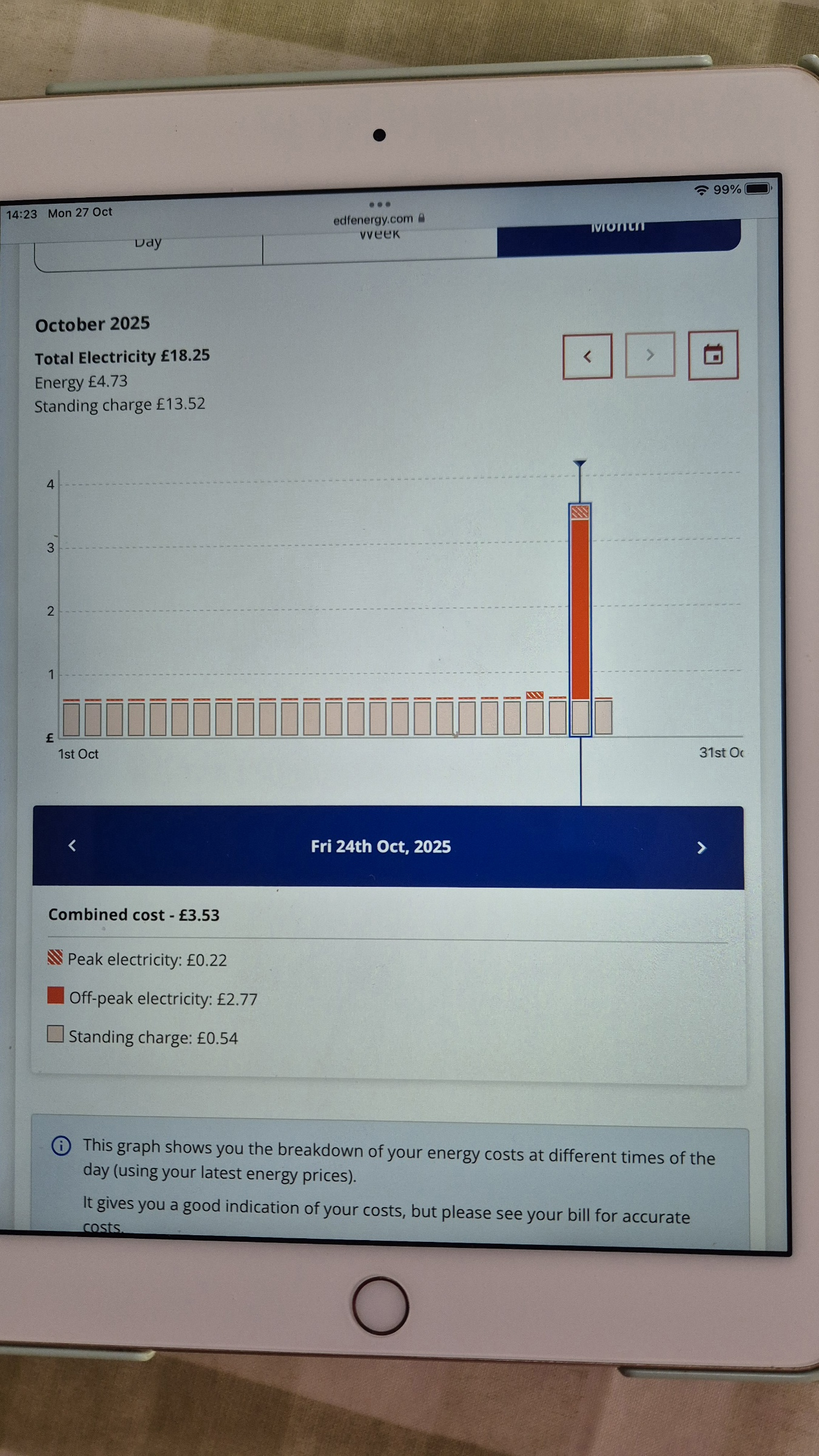 The off peak use dominates here and the price of my electricity for the day is £3.53.