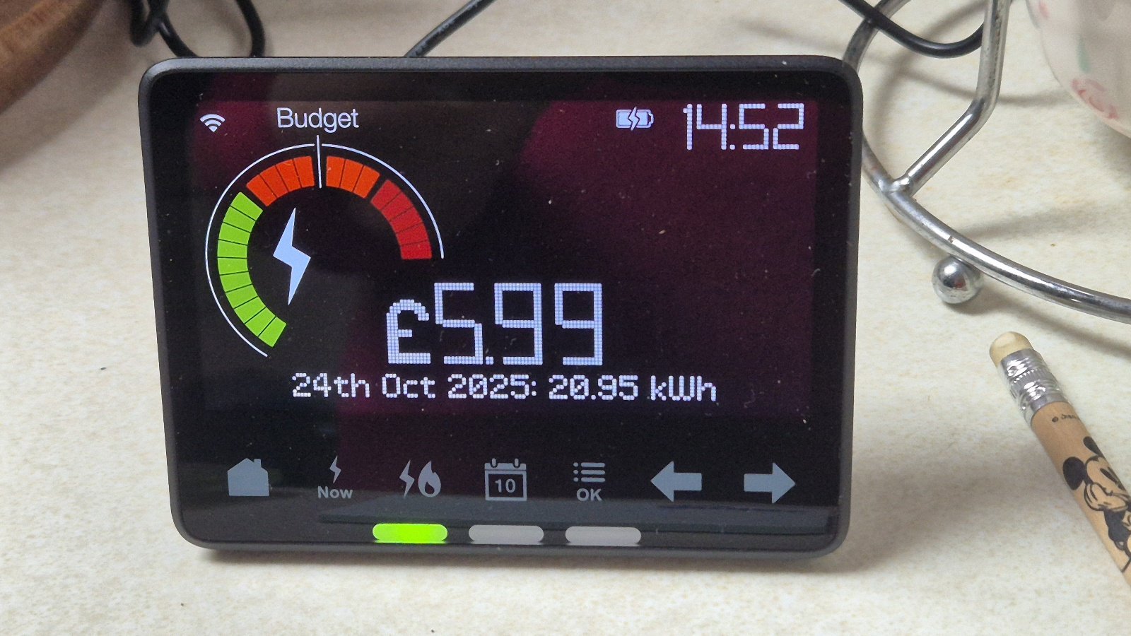 (13 KWh day rate, 8 KWh night rate, read off meter screens) are shown on the gizmo display as costing £5.99. - photo 1