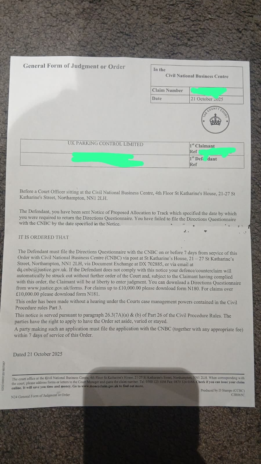 Today, the 21st of October 2025, I received by post the "General Form of Judgment or Order" stating that I failed to file the "Directions Questionnaire".