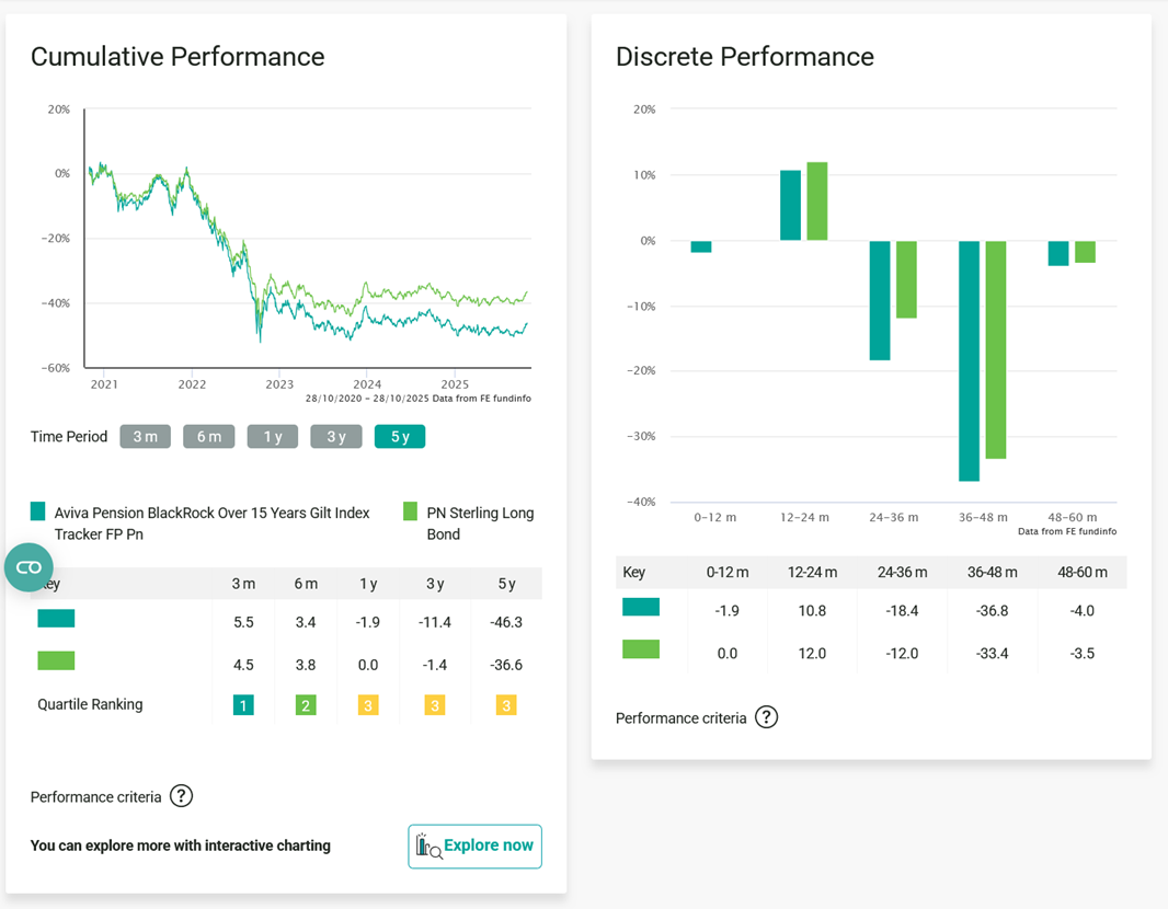 The fund is BlackRock Over 15 years Gilt Index Tracker.QrizB said:Oranda said:All I can see on performance of the guilt index tracker fund I’m in for the last 5 years is -12.0%, -37%, -12.9%,10% and latest is -9.5%. So that was the reason for my initial question as I’m 4 months from retirement.That's unusually poor.What's the name of the fund?https://www.trustnet.com/factsheets/p/lm60/aviva-pen-blackrock-over-15-year-gilt-index-tracker-fp-pnThe current performance isn't quite as you state, but even so it's down almost 50% over 5 years: