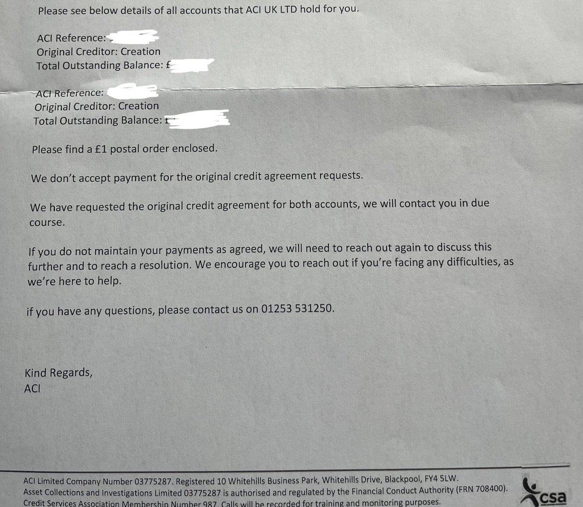 Techincally 3 different debts, the 1st one is on its own and the 2nd on listed is a combined amount for 2 debts that they have under the same reference, almost like sub accounts if that makes sense. 2 debts from different lenders but have the 1 reference number from ACI.Grumpelstiltskin said:Yes don't pay these debts ( if there are 2 different debts you need CCAs for both of them )0 -