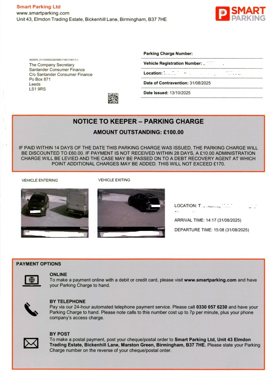 Smart(ish) Parking don't bother with PoFA as can be seen on the attached PCN from Santander.doubledotcom said:If you can't get the payment reversed by your bank, as a disputed payment, then you will have to sue SCF for the money.