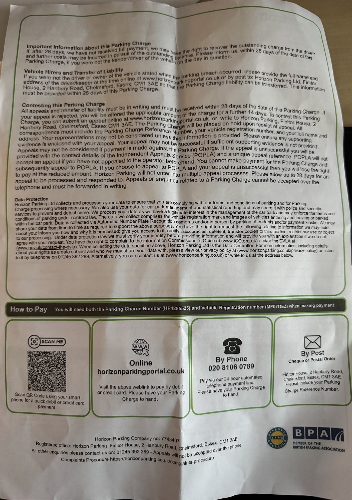 If Plan A fails, then the keeper should appeal to Horizon using the template from the NEWBIES, making sure they don't miss the appeal deadline. Add a one liner that the NTK is non-PoFA compliant and therefore incapable of holding the keeper liable. Suggest they therefore cancel the charge to save them time, money, and the embarrassment of losing at PoPLA.