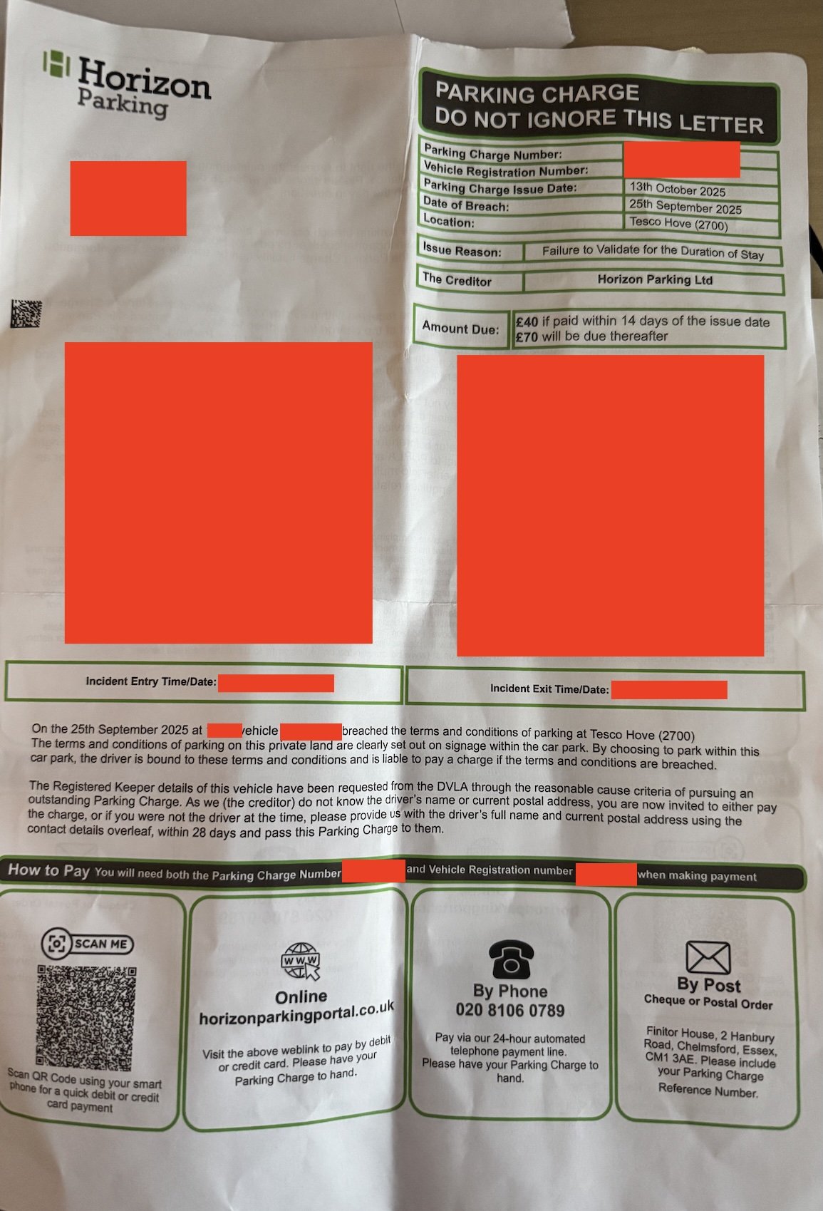 I received a letter on 20th October, dated 13th October, about parking without a validated ticket on 25th September at Tesco, Hove. I had no idea they had re-introduced ticketed parking there, it's been free to park for around 5 years. The signage is awful, and there are many places in the car park where you can walk from your car to the store and back without seeing any at all!