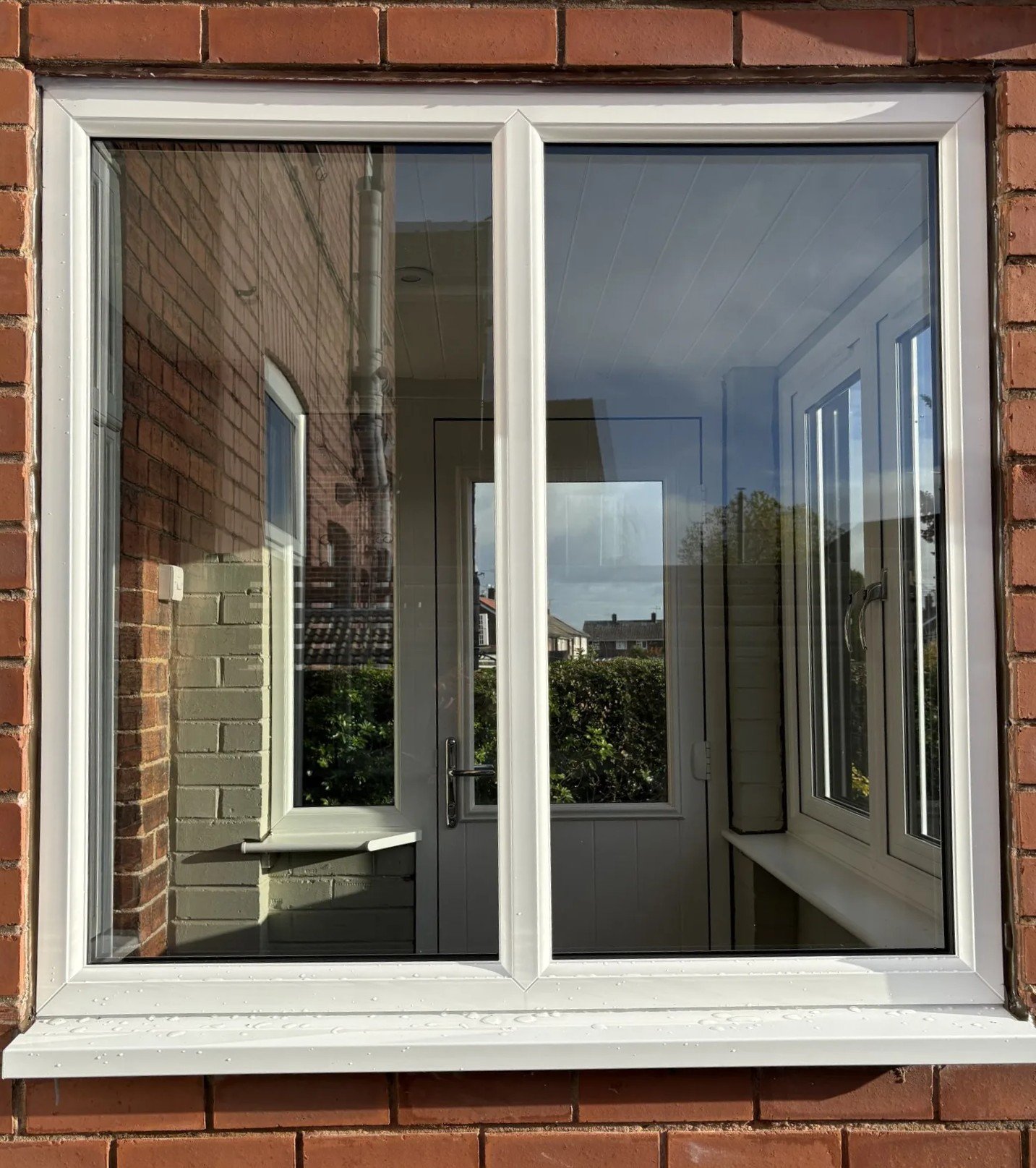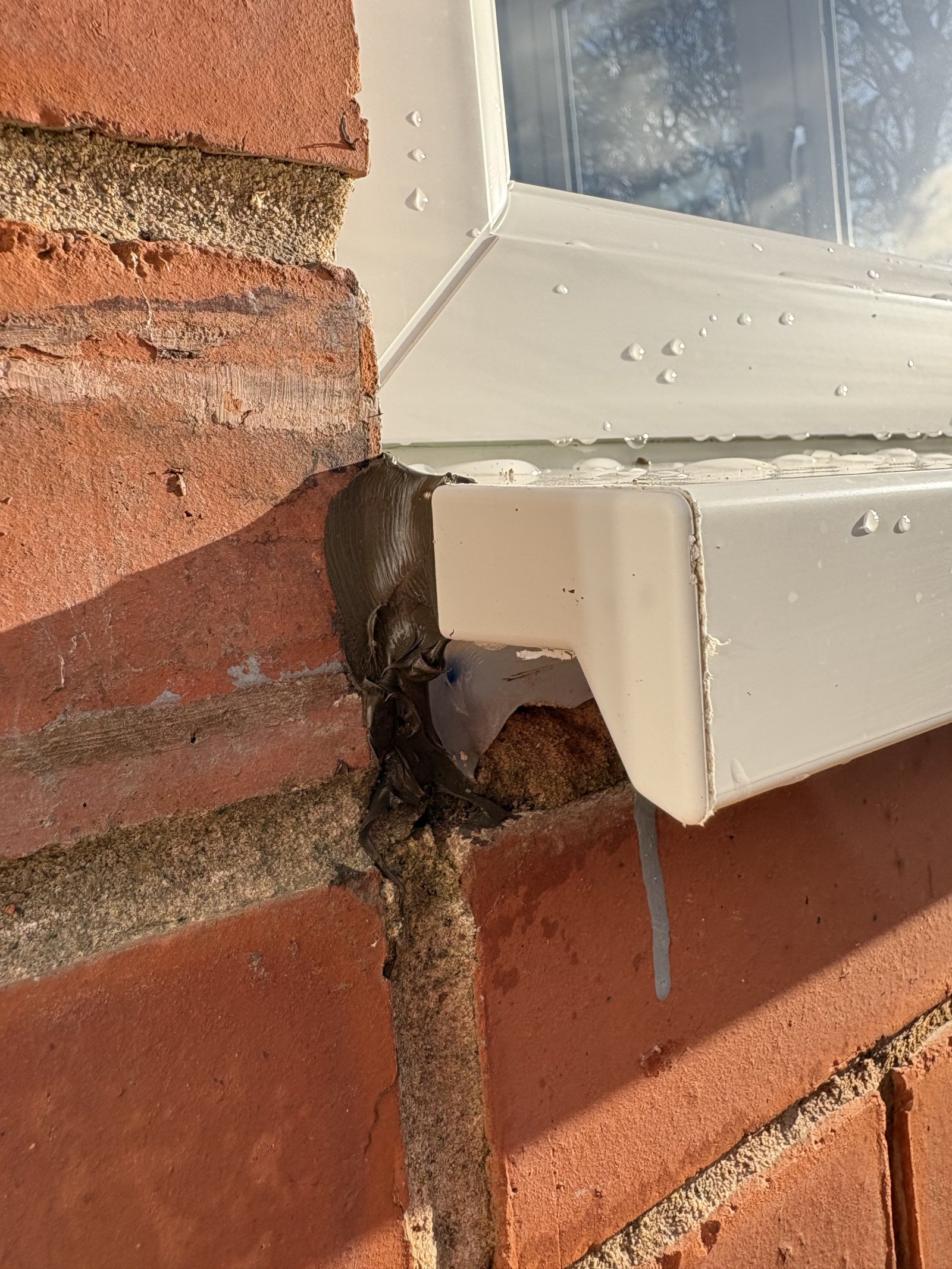 They have at least used masking tape on the frame itself but the colour is all wrong and the application is poor. White silicone can be problematic as well because it’s harder to get a neat edge on the brickwork (especially if it’s a rough textured brick) and you can’t mask it effectively. They should have used a colour which more closely matched the brickwork.