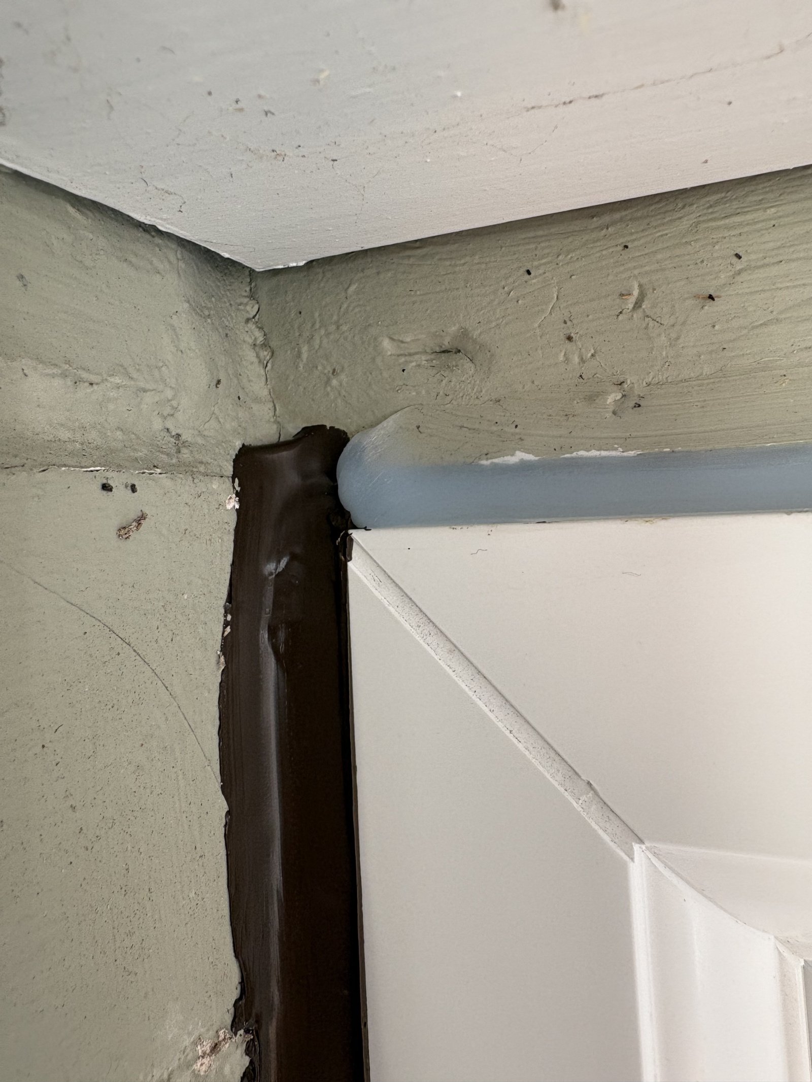 Ditto on some of your inside joints - the windows, and perhaps the RH side of the door inside, and both the outside? Once done - and you stand back and gasp in admiration - then the remaining 'seals' around the window boards could be done in white silicone, but finished using a Fugi-tool. It should look great.