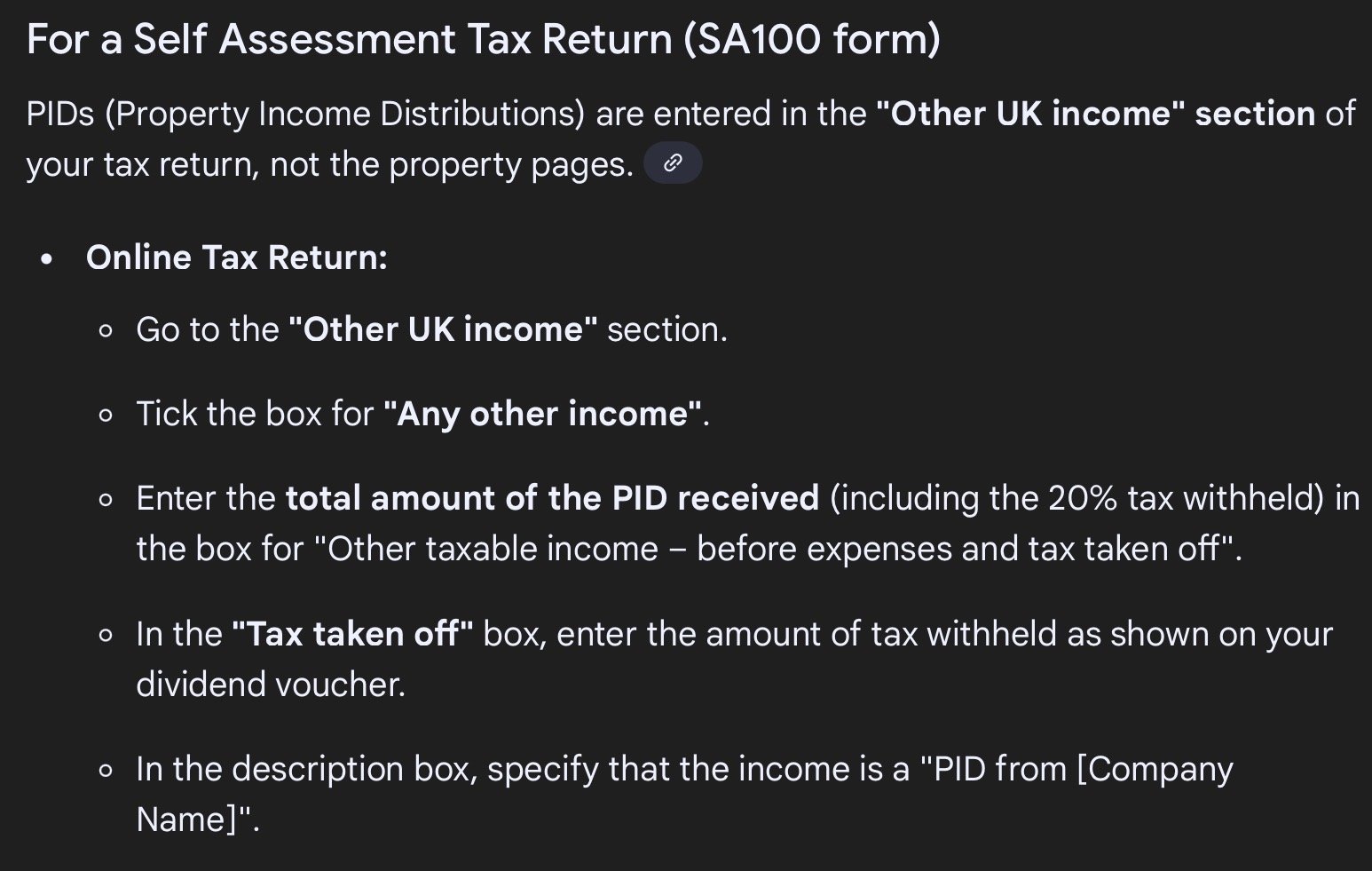 You're overthinking it: it's other income. I receive dividends from the ADRs of British companies via a stockbroker based in America and I still declare these in the UK dividends section because they're British domiciled companies.mouthwatering said:@poseidon1 Thank you very much for the LandSec link... I think I understand the principle behind their explanations but if I've understood correctly they either talk about non-resident investors (which I am not) or UK investors in which case they seem to assume that the PIDs are from a UK portfolio (as they explicitly talk about filling the SA100 form and not SA106).
