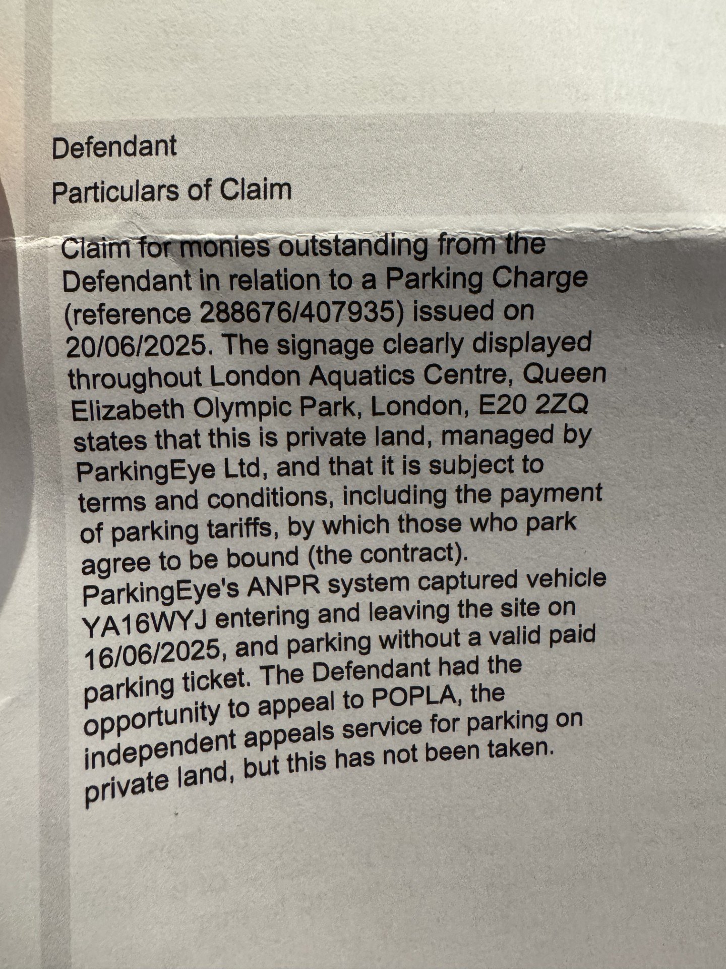 I harassed the leisure centre to get it cancelled which they said they would do - so I did not complete the POPLA appeal. I then got the LBCCC and now the Claim. I am still chasing the leisure centre who have said they told Parking Eye to cancel but it is up to Parking Eye to correspond to that with me.