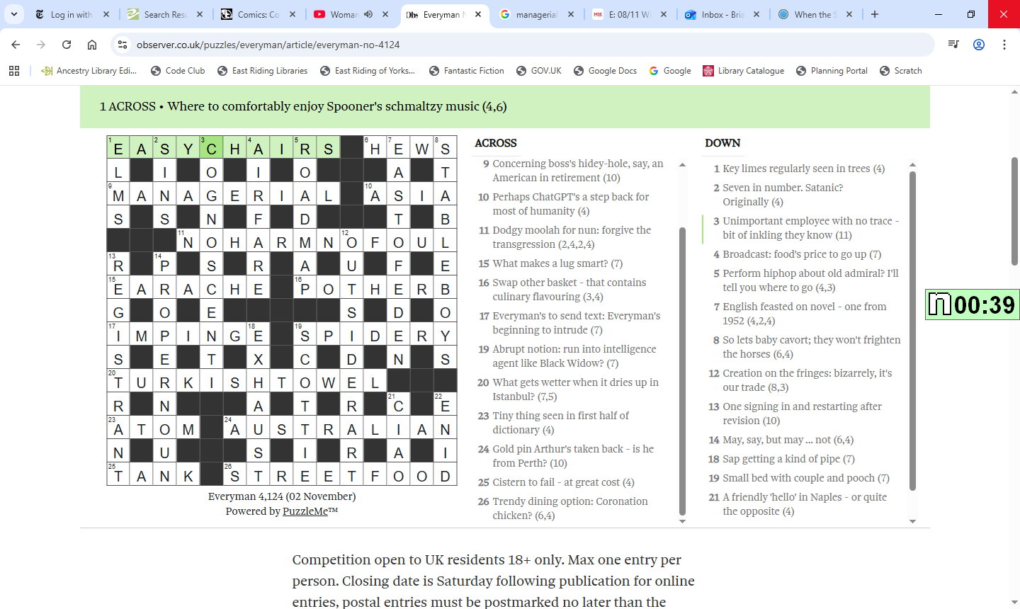 E: 08/11 Win £15 Book Token (The Observer Everyman Crossword, 4124) (Help please)
