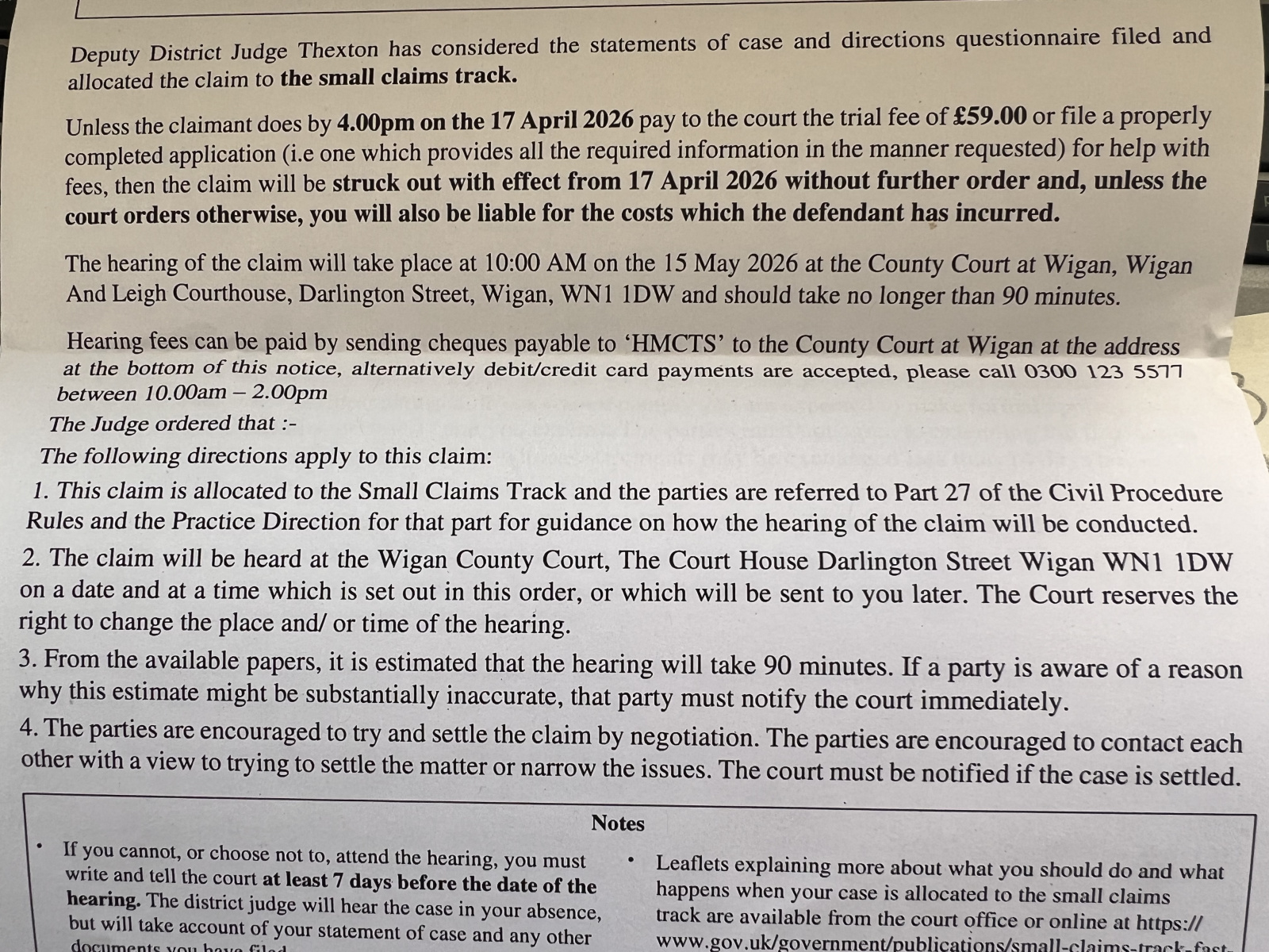 So 17th April for them to pay the hearing fee and 15th May for the hearing, so when is the deadline for the WS. ?