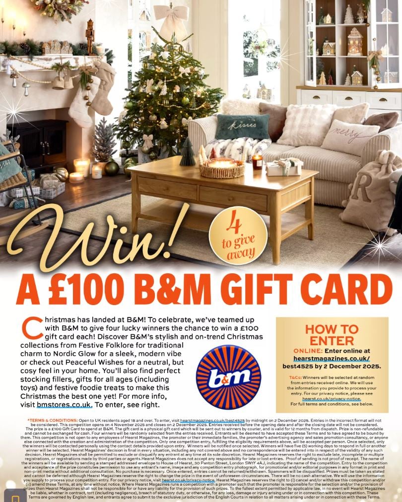 The prize is a £100 Gift Card to spend at B&M. The gift card is a physical gift card which will be sent out to winners by courier, and is valid for 12 months from dispatch. Prize is non-refundable and cannot be exchanged for cash. Four winners will be randomly selected from the entries received.