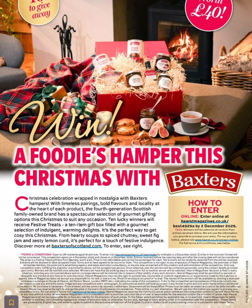 The prize is a Festive Treats gift box from Baxters, worth £40. Prize is non-refundable and cannot be exchanged for cash. Ten winners will be randomly selected from the entries received