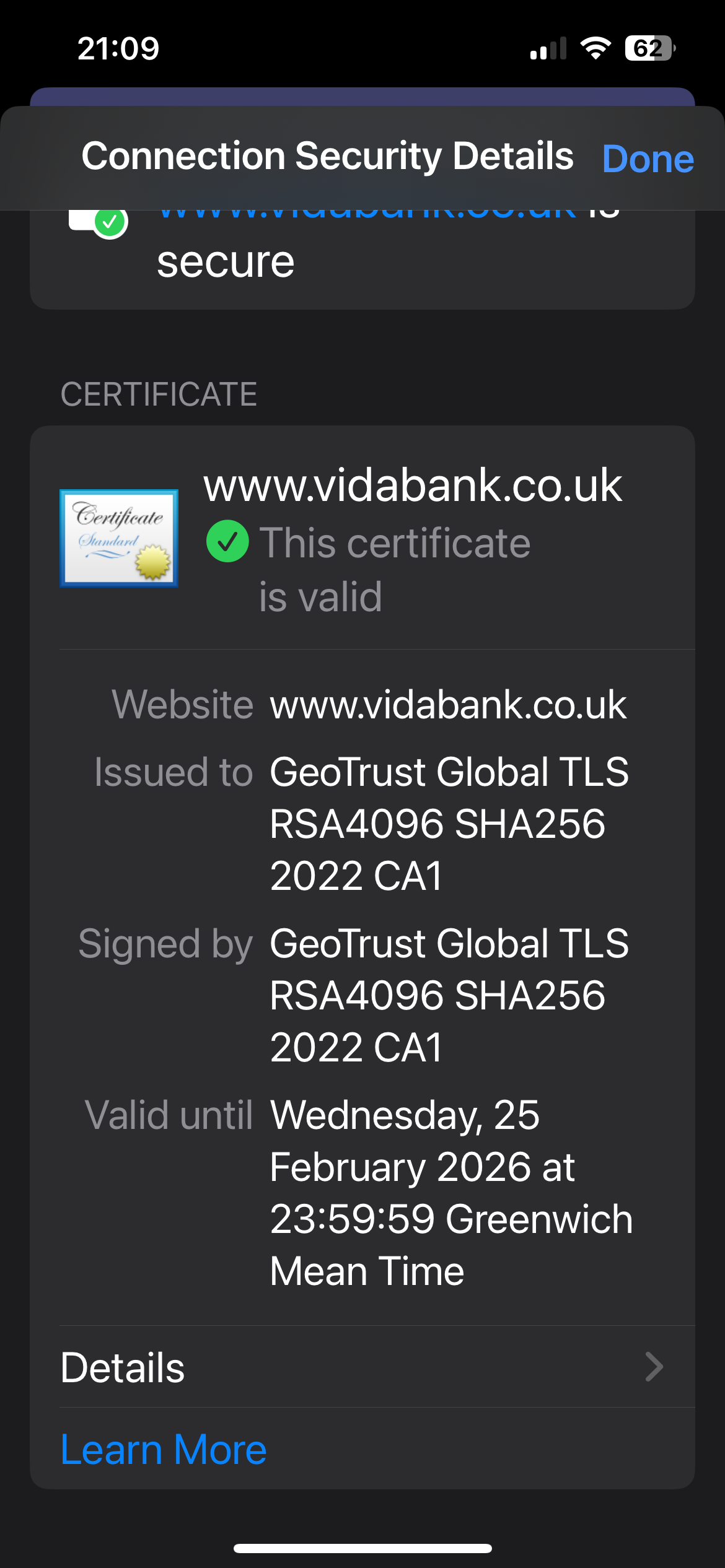 I've opened an ISA with Vida Bank ready to transfer in another ISA. They have sent me a letter to authorise my linked account and the instructions say to visit their website at www.vidasavings.co.uk. I have tried this on Chrome, Edge and Norton browser and all three come up with a message stating that the website is Not Secure. I have phoned them and the customer service rep told me that it doesn't work on all browsers. The website Homepage - Vida Savings does work. Are Vida safe?