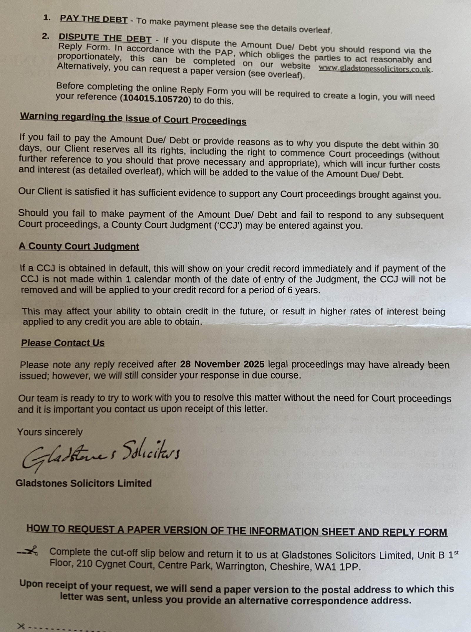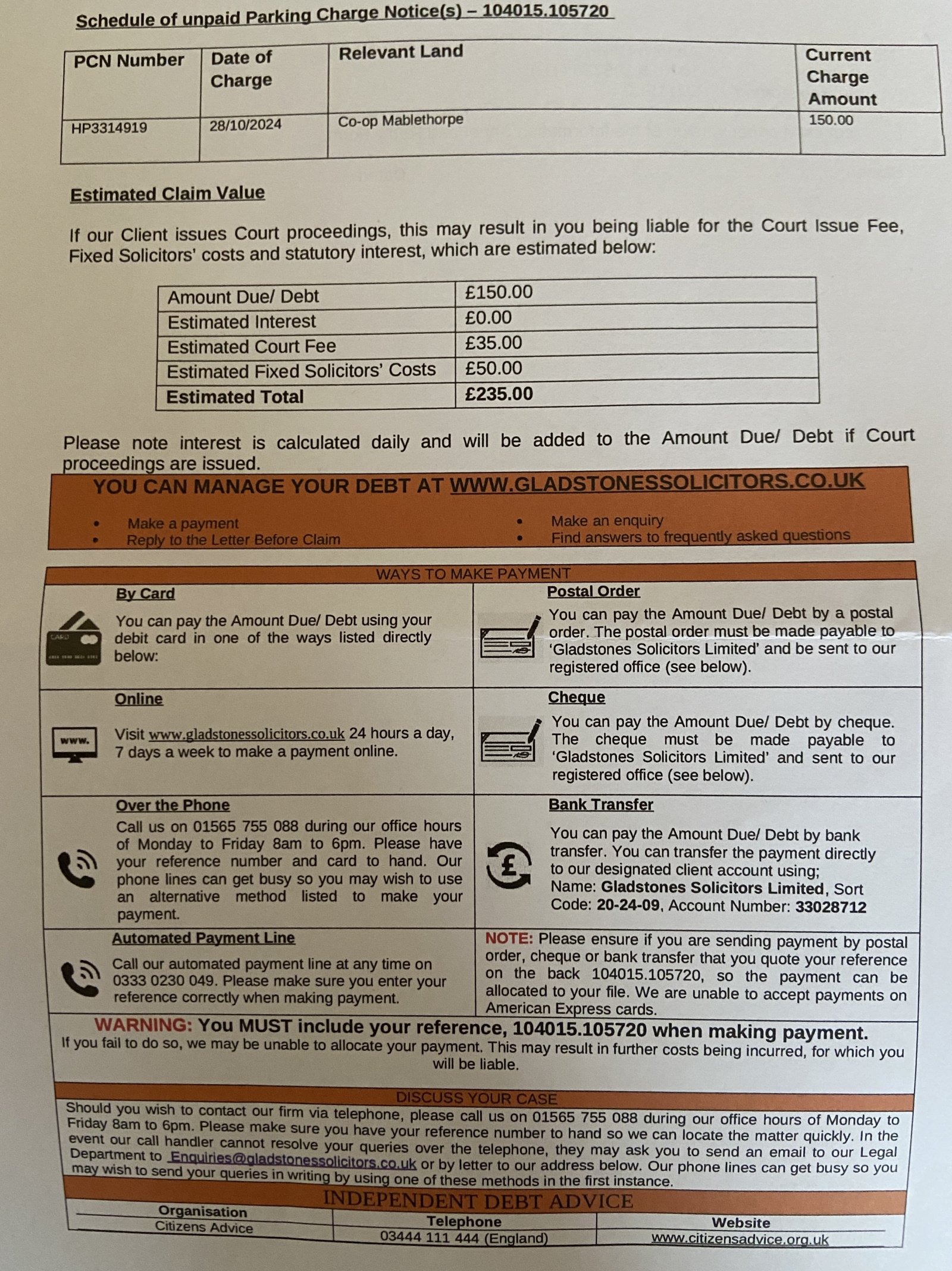 Using no real names as per forum rules - just call me Mr Stress Head. Received a Letter Before Claim letter from Gladstones Solicitors. They are acting for the Coop, Mablethorpe. This is the first time I have received any correspondence concerning parking. You can stay at the Coop car park for a max of 2 hours however I usually make more than 1 trip there on any given day and certainly never stay beyond the allotted 2 hours. I’m pretty certain that the technology (provided by Horizon on behalf of the Coop) has recorded the entry time for the earlier visit and matched it against the exit time for the later visit. This has happened many times with other users. The letter from Gladstones just gives me a date 24 October 2024. There are no further details given such as entrance exit times or images. The letter does mention that I can dispute the debt by through an online Reply form but I can’t find it on their website.