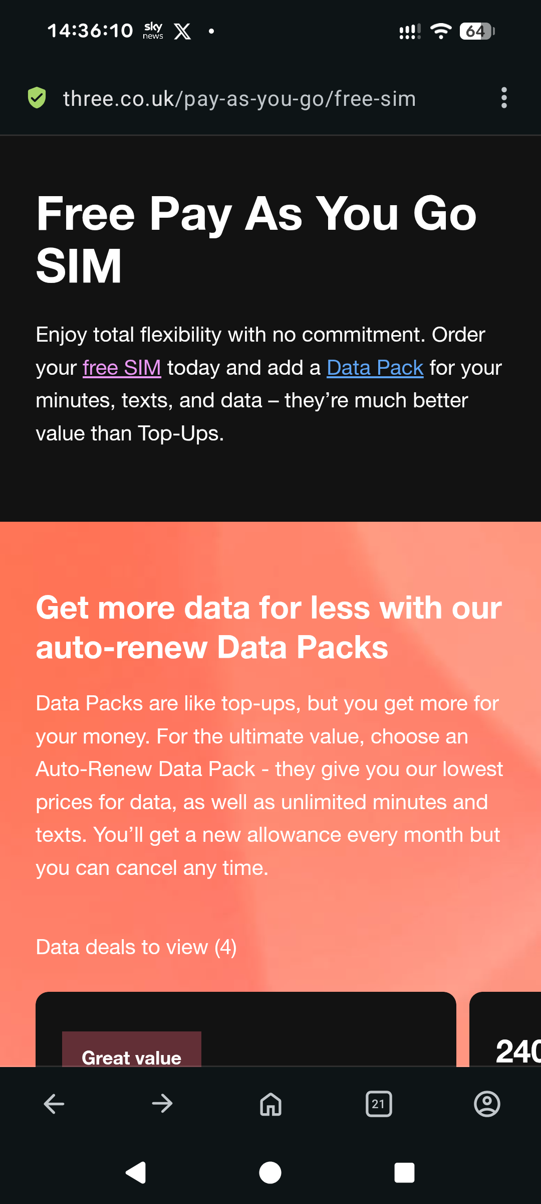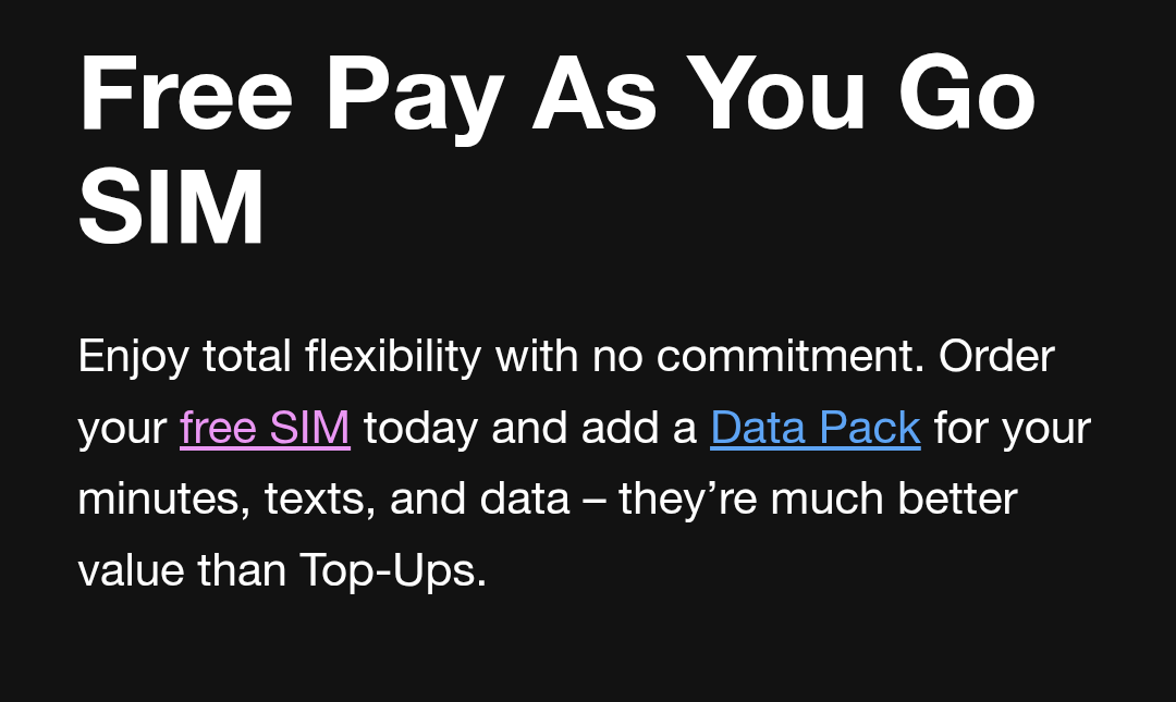 Very true, but the OP request was for a free SIM card, not a good value one.Neil_Jones said:Three is insanely expensive for PAYG:https://www.three.co.uk/support/pay-as-you-go - Calls - 35p a minute Texts - 15p a text Data - 10p a MBYou can probably get better elsewhere purely for rates.https://www.moneysavingexpert.com/mobiles/best-pay-as-you-go-sim-cards/