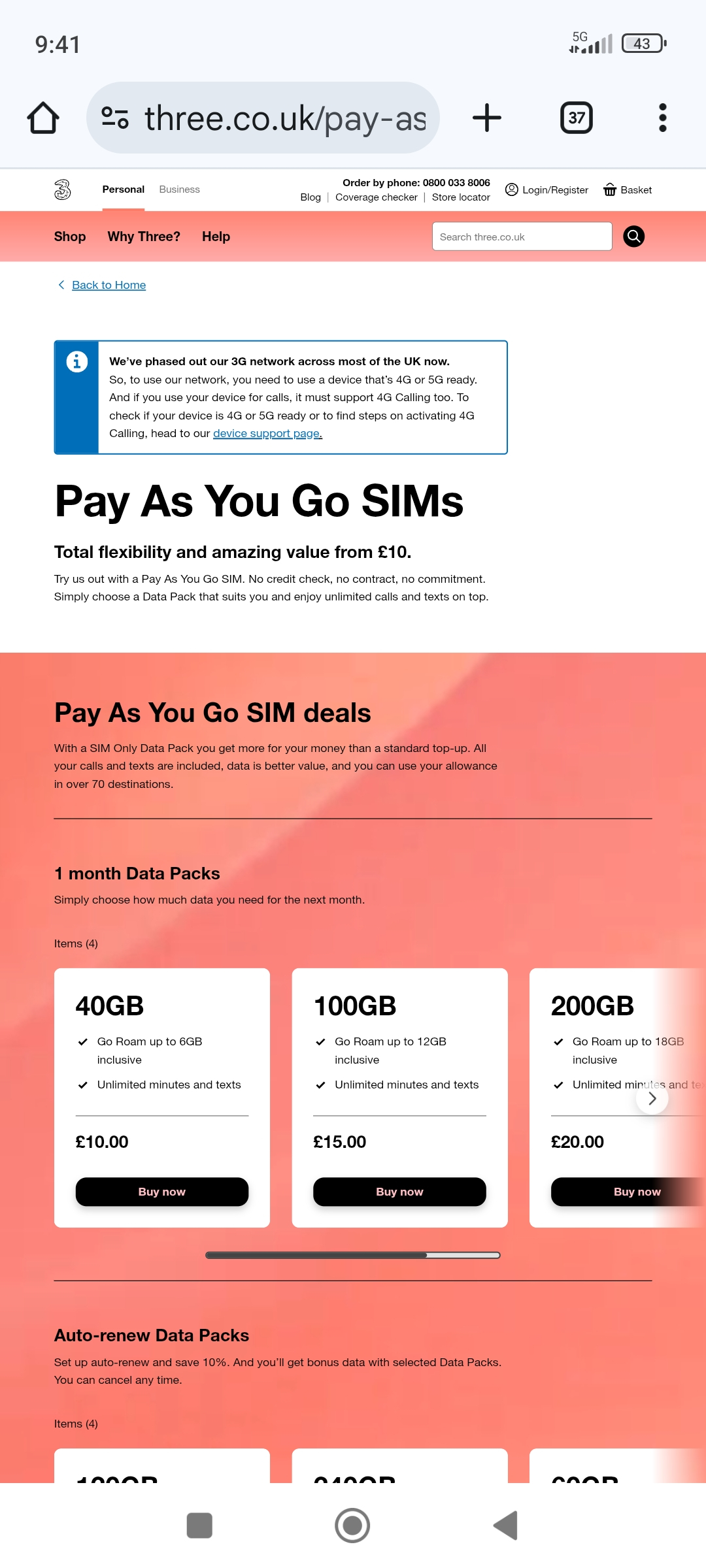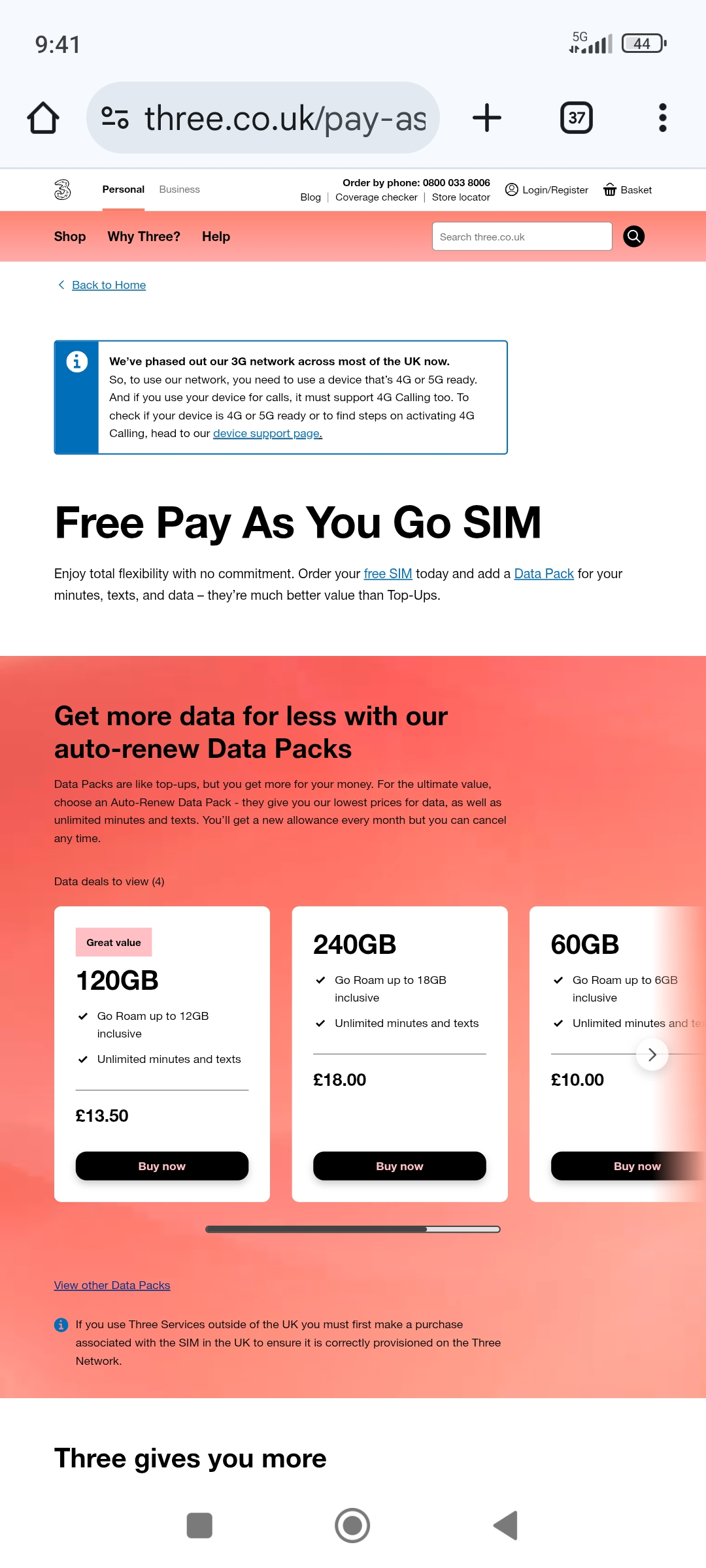 Three is insanely expensive for PAYG:https://www.three.co.uk/support/pay-as-you-go - Calls - 35p a minute Texts - 15p a text Data - 10p a MBYou can probably get better elsewhere purely for rates.https://www.moneysavingexpert.com/mobiles/best-pay-as-you-go-sim-cards/0