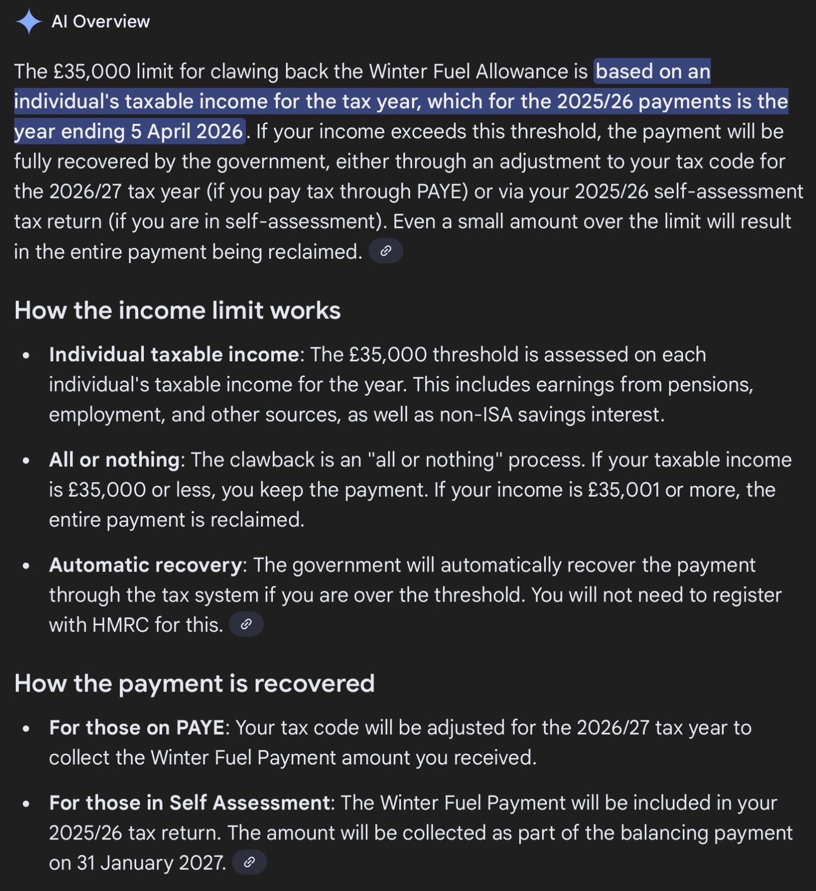 bonalymacd said:I am perilously near the 35,000 limit for clawing back the Winter Fuel allowance through my tax code, and it is touch and go whether I breach the £35,000 figure. My wife is not particularly near it.