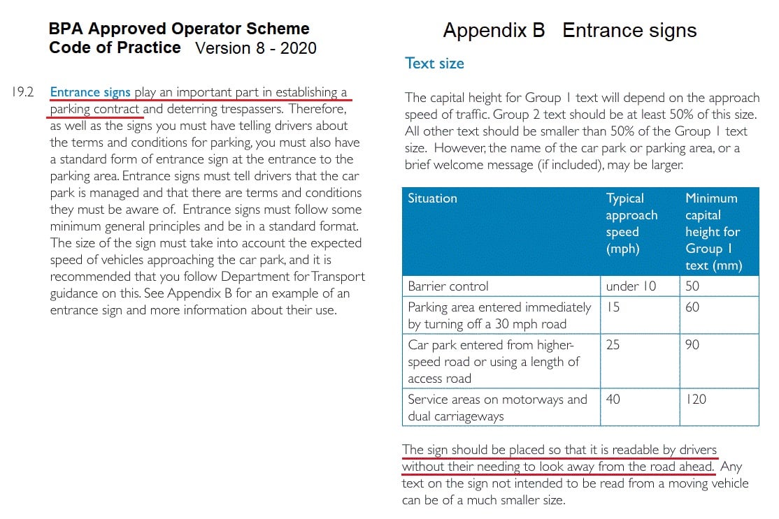 POPLA rejected my appeal, citing adherence to the BPA Code of Practice, particularly the section on 'entrance signs'. This was the first time I had heard of the code, so I researched it myself. Version 9 of the code (which was in force at the time of the charge) clearly states that where restrictions apply, there must be a visible sign at the entrance.
