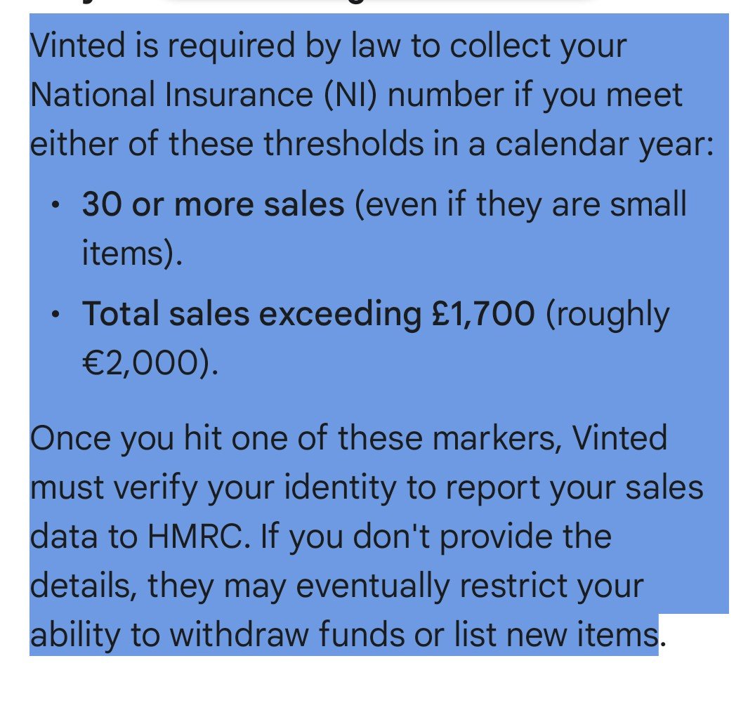 So on my personal account vinted wanted my Nat Ins number but sent my an email to state that i didn’t need to fill in anything to HMRC.