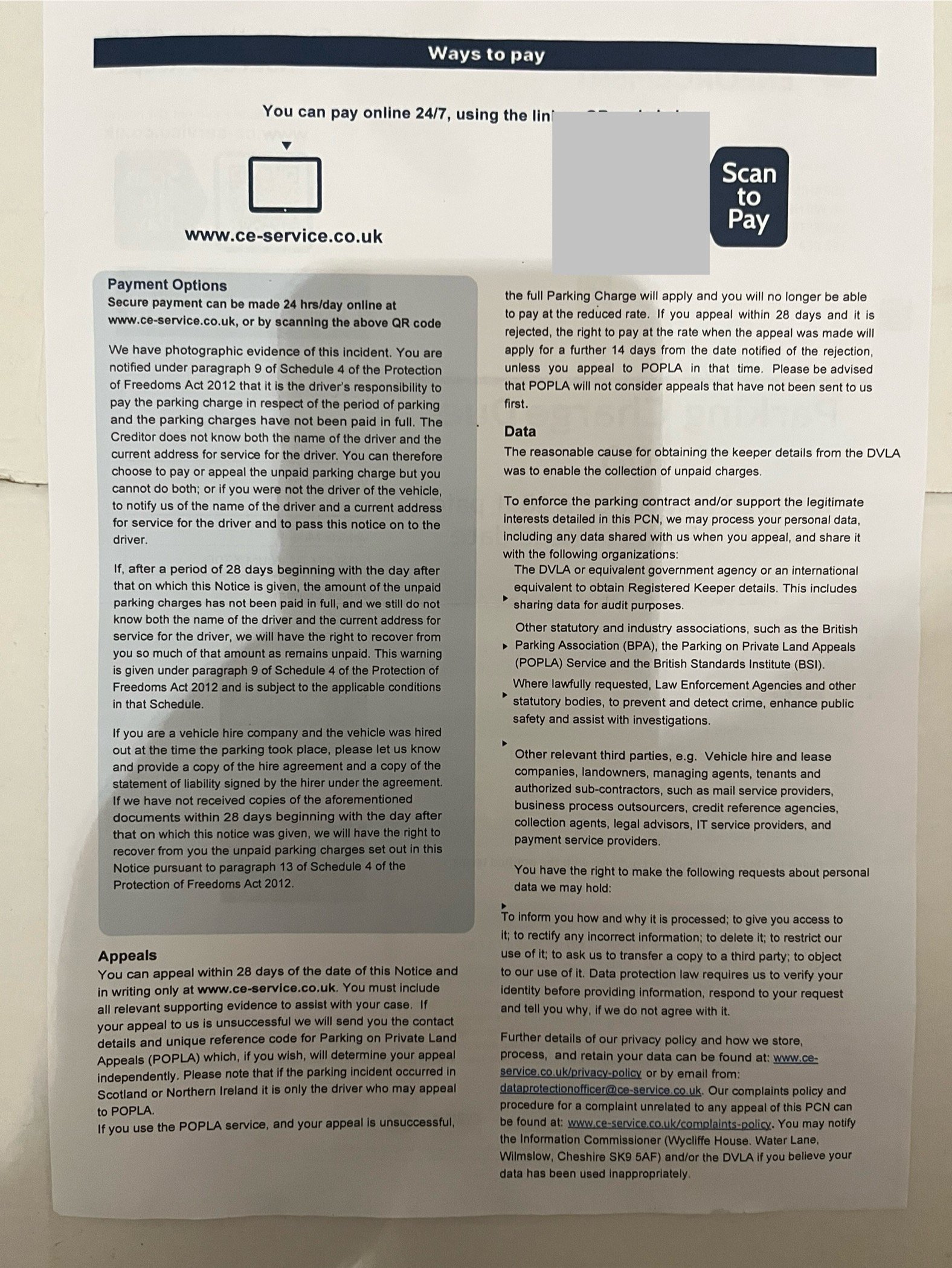 Hi, got a NTK PCN from the above. It appears to me to be in compliance with POFA but images are posted. I have read a few other posts about Civil Enforcement and what from what i gleaned is that 99% of the time they reject the appeal. I have already used plan A,ie, complain to the land owner who essentially told me its my problem if i can't read signs I wasn't the driver so have no clue what the signs said, but i did ask my cousin, who was the driver at the time and he didn't take notice of signage as he was only there for a short period. In 100% of cases i wouldn't name the driver but in this case he has said to give them his details & he'd love to see them try & chase him in Africa for this. If it did go to court eventually i'd have proof of him being here & the temp insurance that covered him using the car. Or should i just go with One Size Fits All Template?
