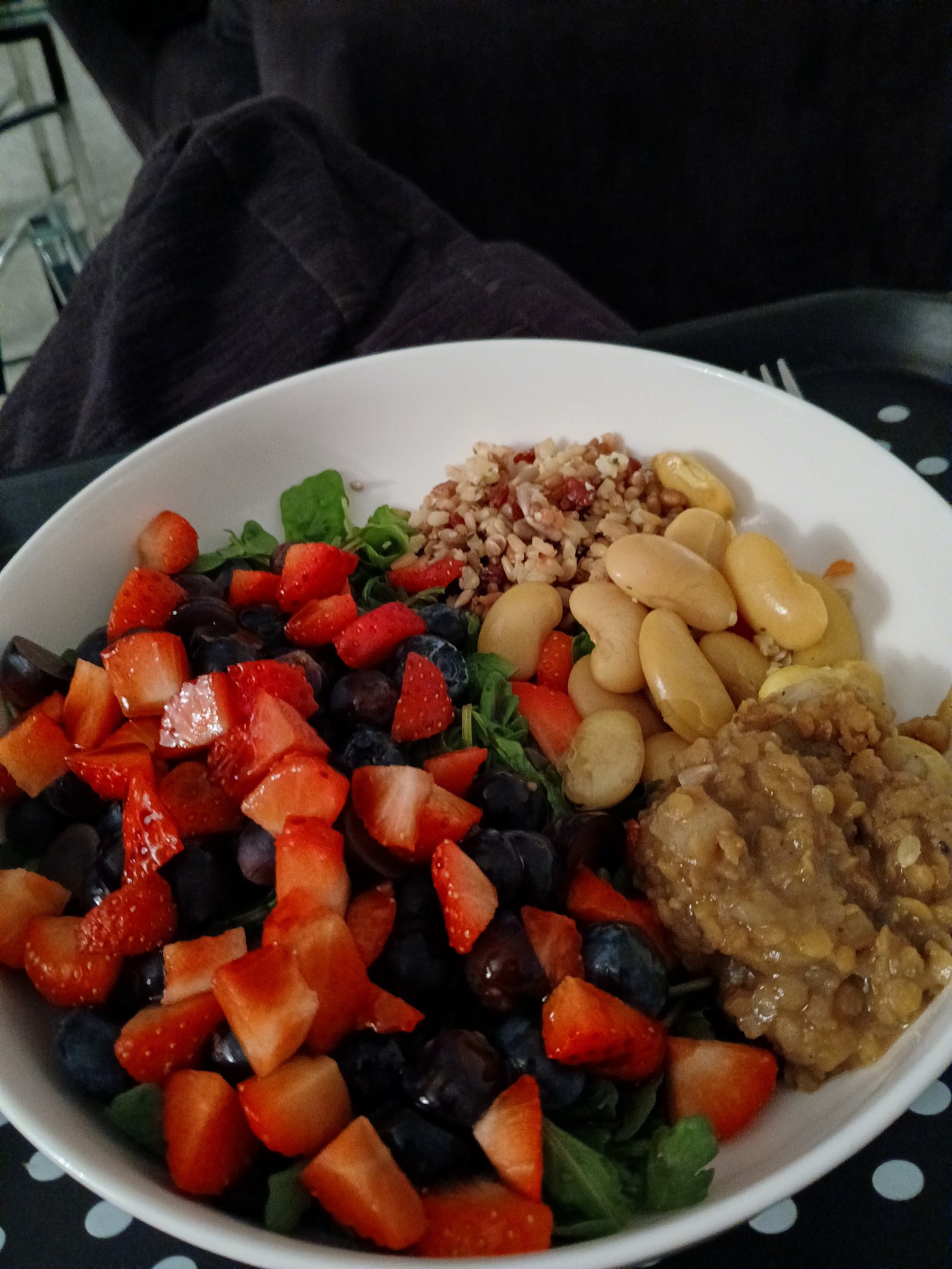 A simple but absolutely delicious one last night - butter beans, ethiopian lentils, mixed grains, rocket, blueberries, strawberries, black grapes and blood orange balsamic 😋