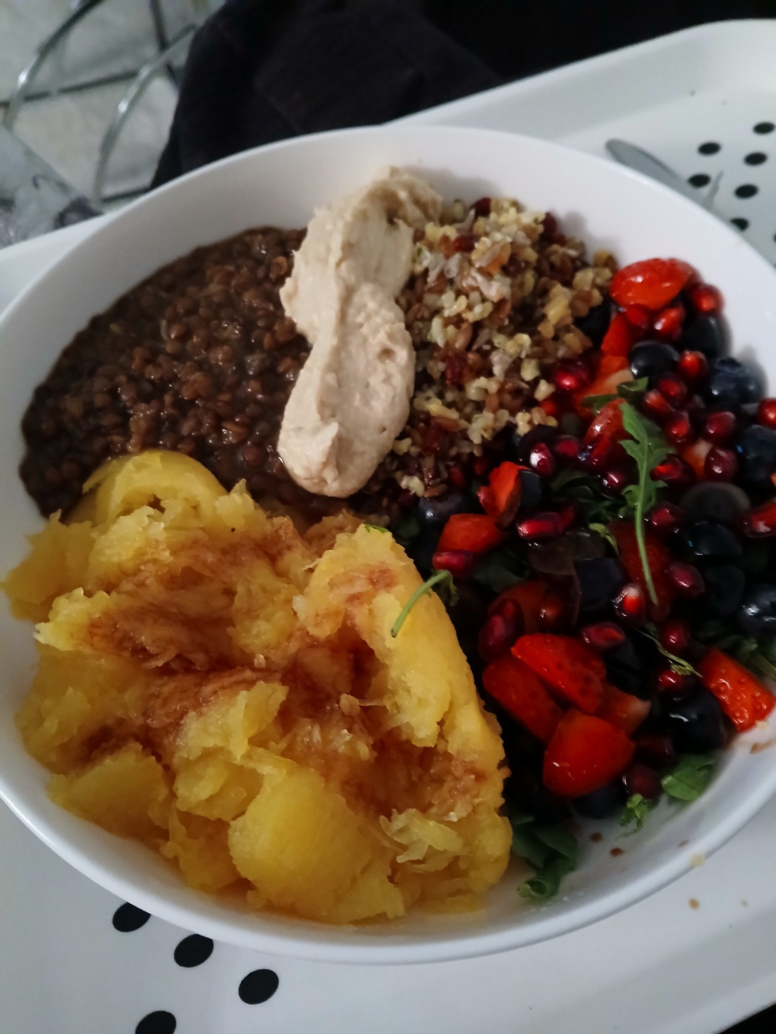 Simple dinner tonight as I couldn't be bothered to do much cooking! Dark speckled lentils, grain mix with barberries and seeds, spaghetti squash, rocket, blueberries, strawberries, black grapes and pomegranate with blood orange balsamic and a big dollop of hommous 😋