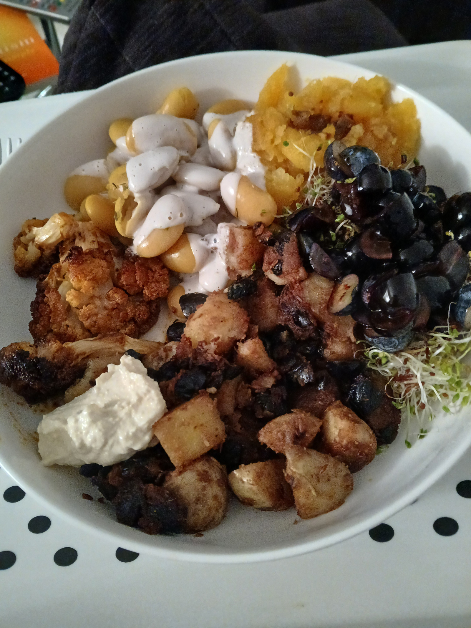 Tonight was harissa roasted cauliflower; butter beans with cashew cream; spaghetti squash; cumin and olive fried potatoes; hommous; broccoli sprouts; black grapes; blueberries and blood orange balsamic 😋
