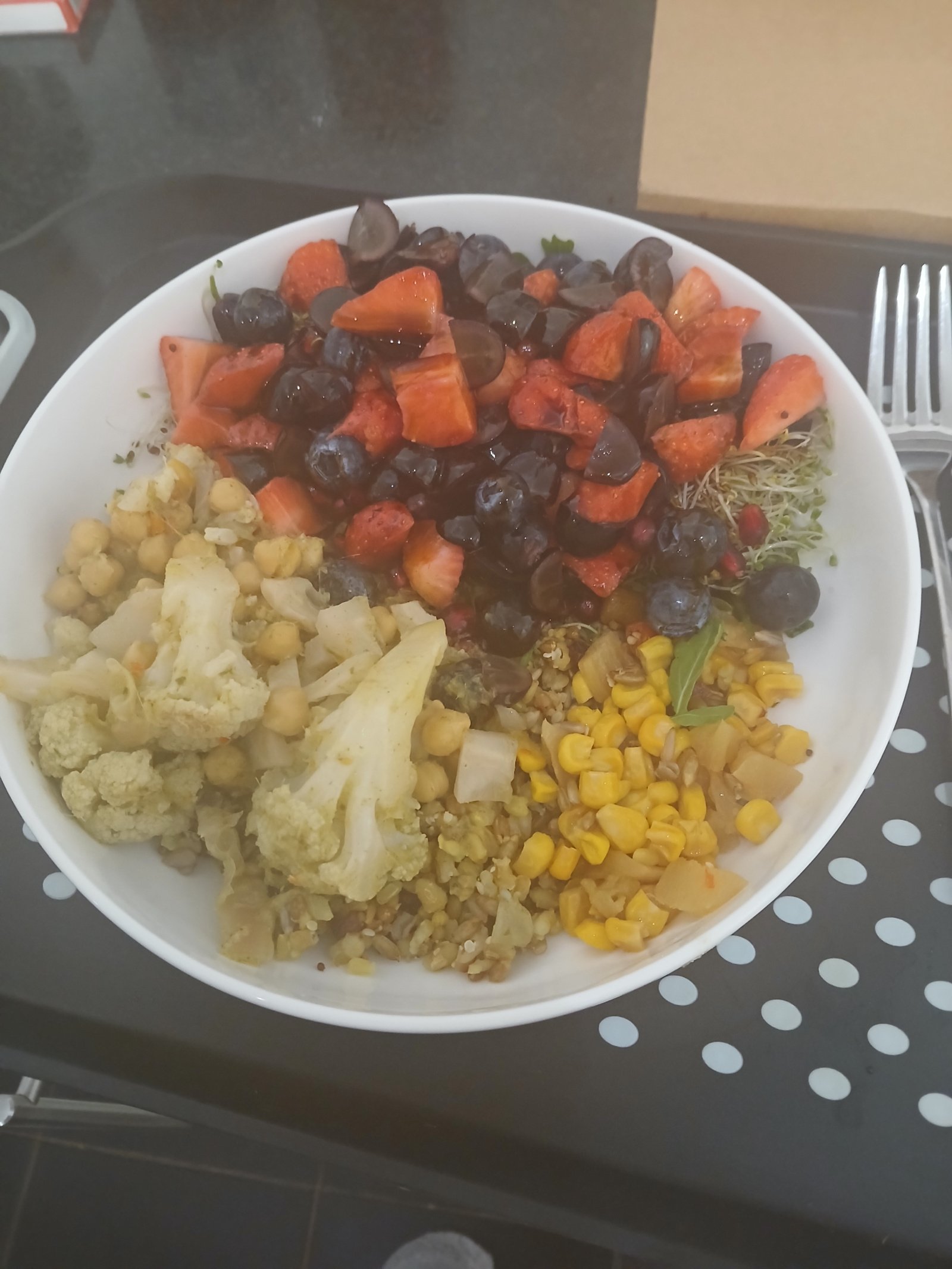Cauliflower and chickpea thai curry tonight with mixed grains, the remaining pineapple and sweetcorn salsa and salad - lovely but I may have overdone the chillis!! 🥵🤦♀️😂