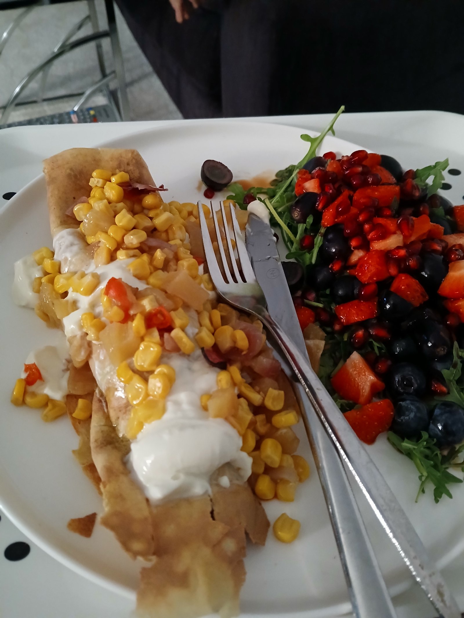 Yummy dinner last night - quinoa wraps with banana blossom chilli, pineapple and sweetcorn salsa, greek yoghurt and a rocket, strawberry, blueberry, black grape and pomegranate salad with blood orange balsamic 😋😁