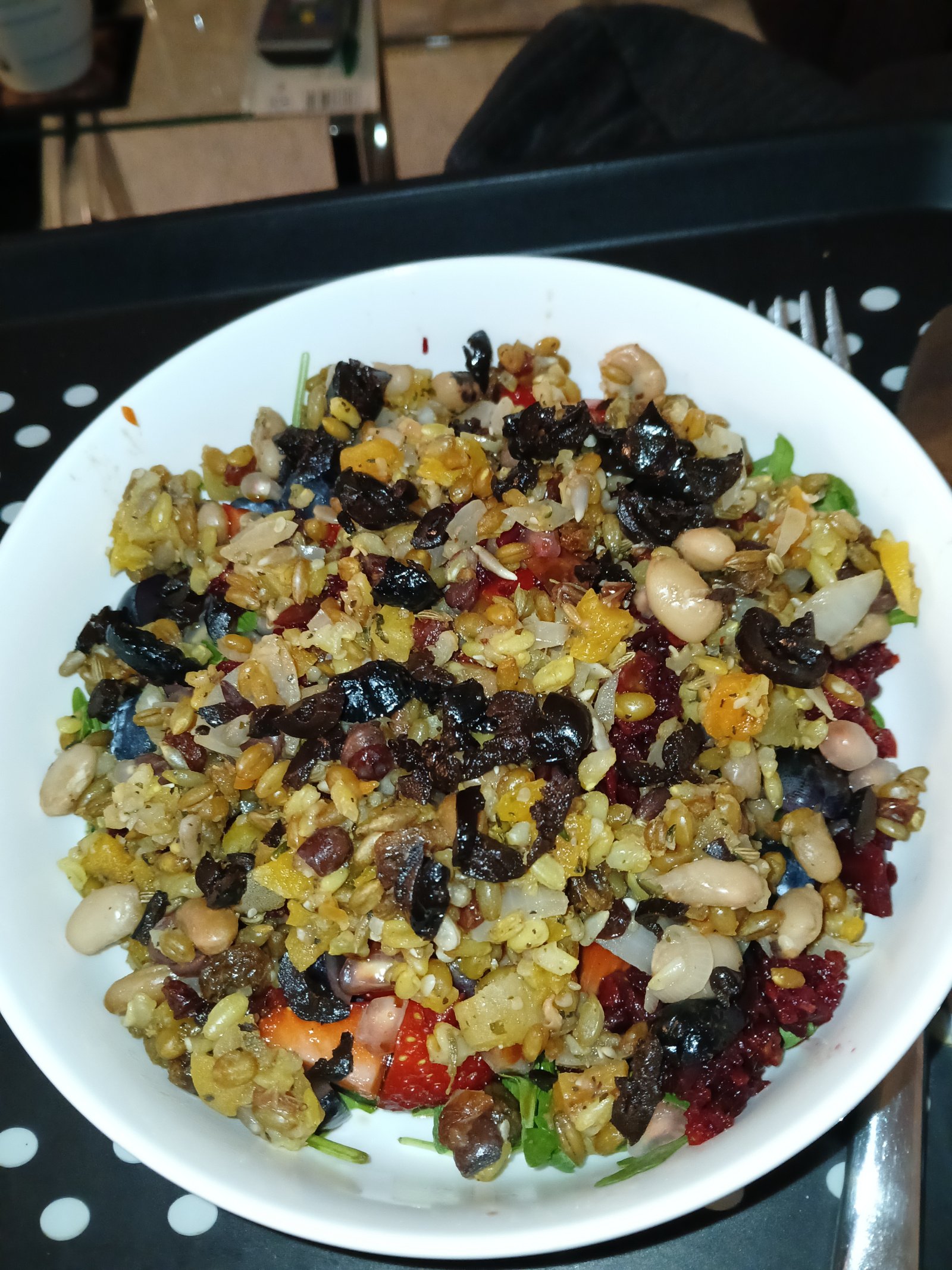 Decided to do a pilaff tonight - leftover mixed grains (that have sunflower seeds, hemp seeds and barberries mixed in); dried apricots; onions; raisins; fennel seeds; longpepper; mixed beans (cannellini, black eye peas, black beans) all cooked on the hob. Served it on a bed of rocket, pomegranate, strawberries, black grapes, blueberries, beetroot and apple and topped with black olives. Delicious! 😋