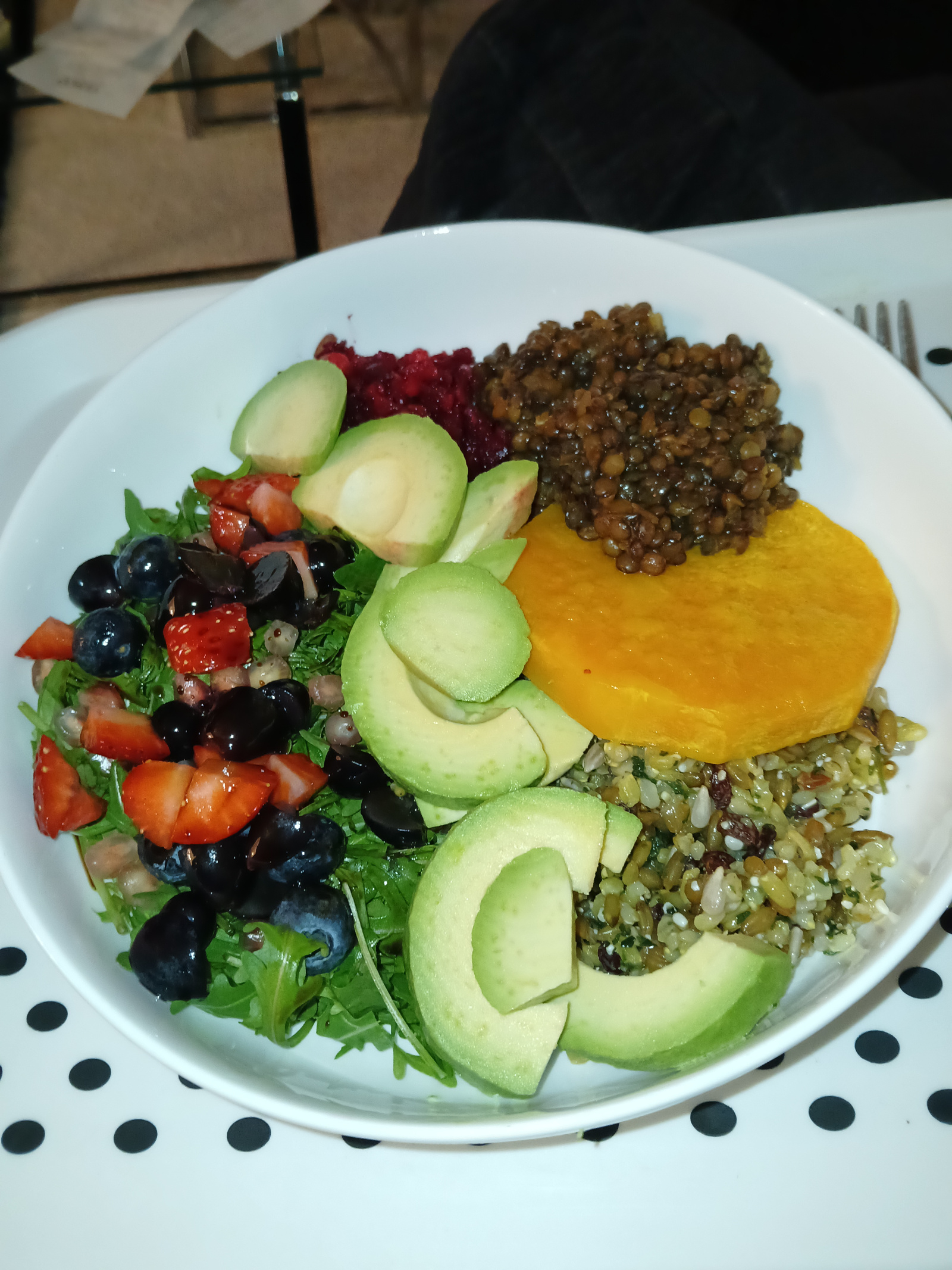 Dinner eaten 😋 butternut squash slices with dark speckled lentils; beetroot and apple salad; rocket, blueberries, strawberries, black grapes and pomegranate salad with balsamic; mixed grains (rye berries, barley groats, oat groats and short grain brown rice) with coriander, sunflower seeds, hemp seeds and barberries; avocado. Absolutely lush!! 😍