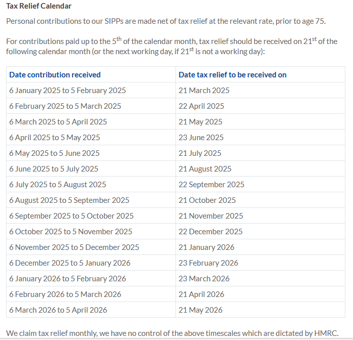 Interesting thread and good learnings, I too was a little annoyed when I moved from Scottish Widows to AJ Bell and saw the crediting of tax relief change from instant to almost 2 months later... it is annoying with investments when you want to acquire units with the whole lot at once.0