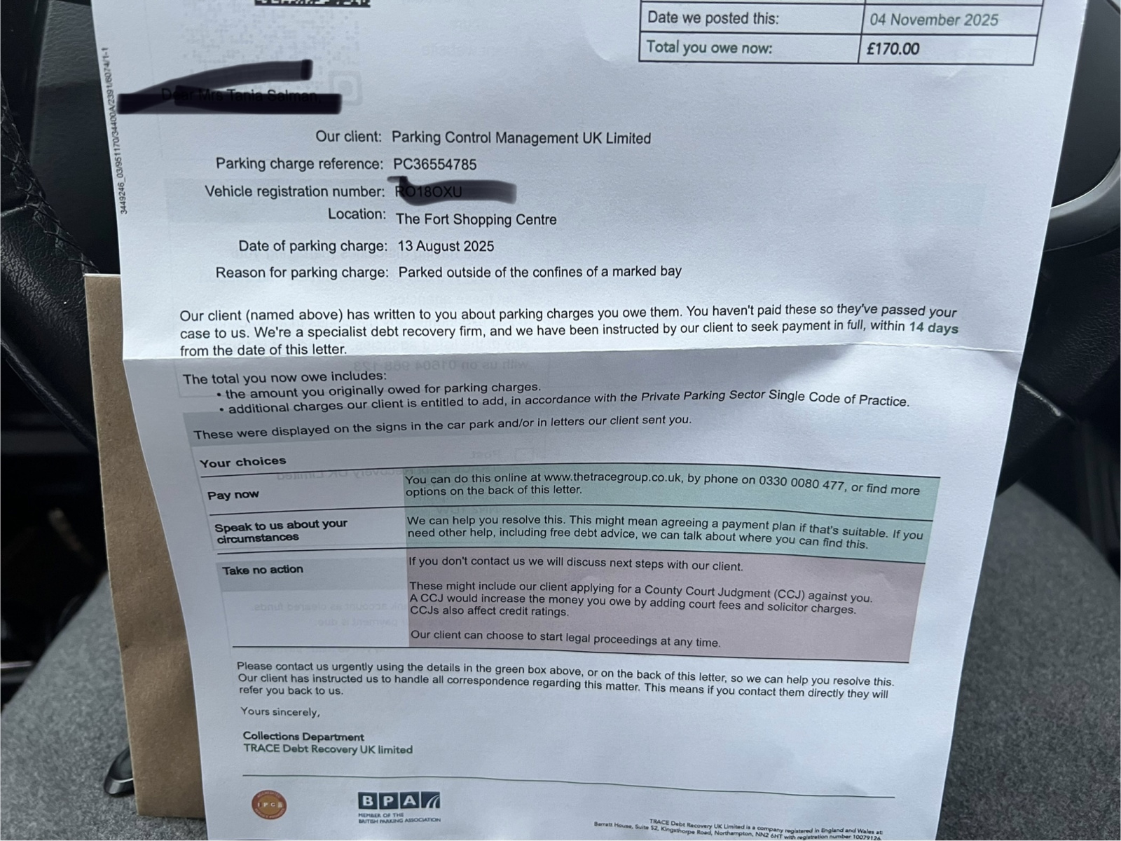 I parked outside the marked bays at a shopping centre. Parking was free, but one of my car’s wheels was slightly over the line and into the next bay. I still received a fine by PCM( parking control management ltd)