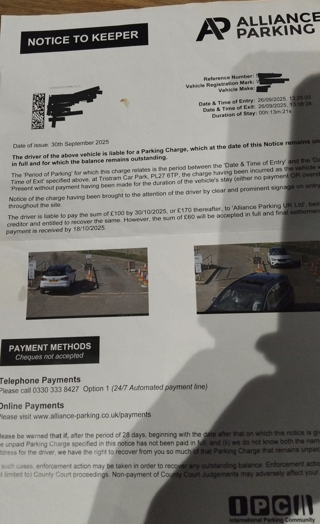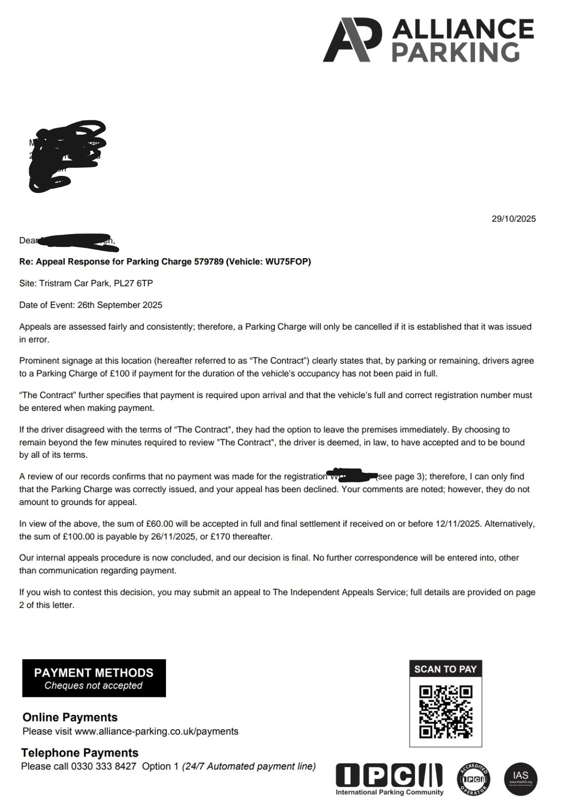 I initially contacted Alliance before reading your initial advice. I argued on the basis of being there for 13 minutes, the time it took to drive to the bottom section of this carpark down a poor quality road, going to the machine to find it enclosed in a locked shed. Trying on mobile with no signal before then leaving. As you can see, the appeal was refused.