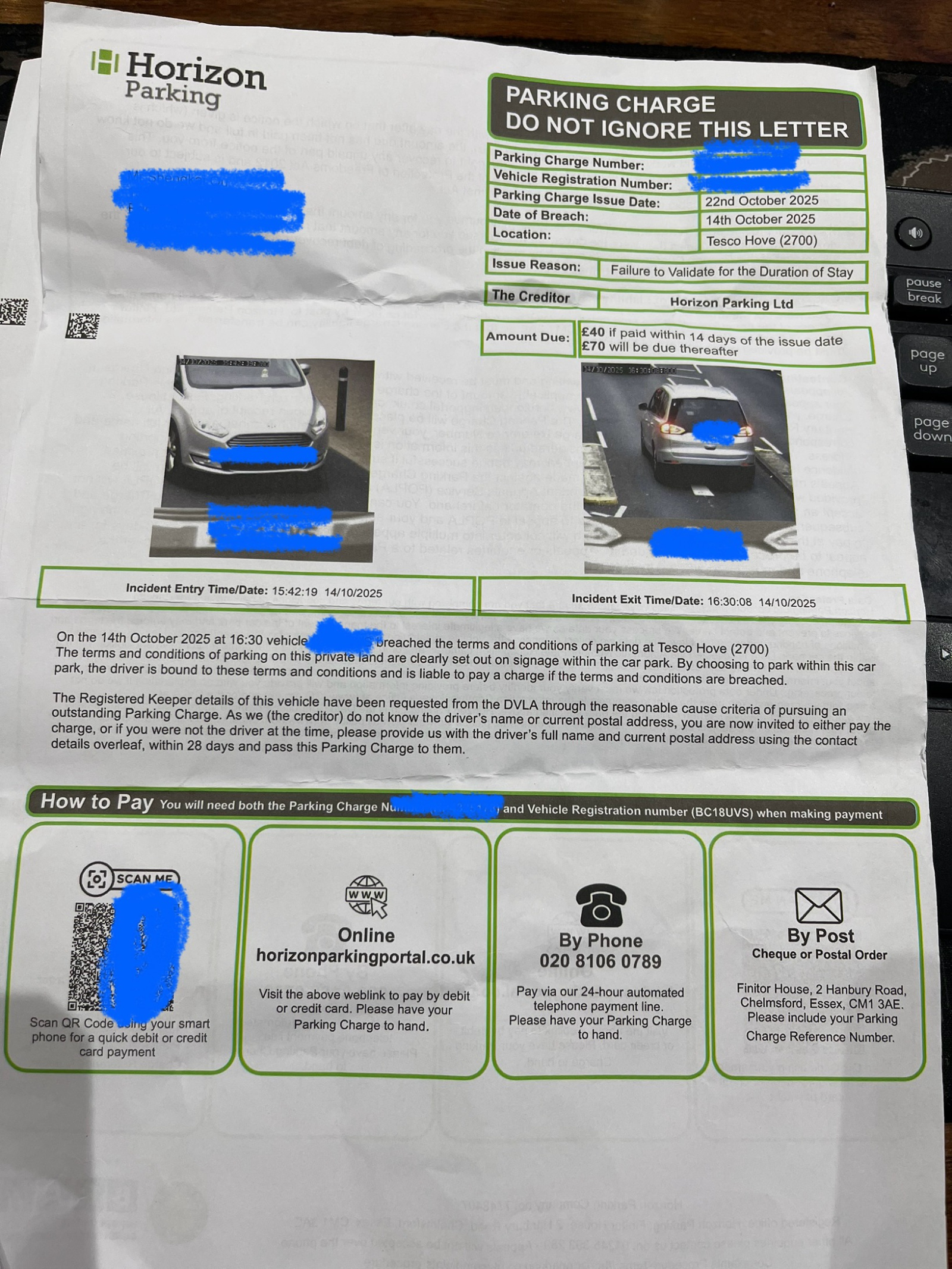 The last PCN was issued on 22nd Oct 2025 for a parking event on 14th Oct 2025. A shopping receipt for 14th Oct was also found in the car. I would not have received so many PCNs, if they issued the first one earlier. I am drafing for the last parking ticket appeal. I went to Tesco Hove, but was fobbed off by their staff. I did not even have a chance to see the manager. There was no sign or reminding messages at the exit or entrance of the store either. I did not find one. Can I get some advice, if possible please? I don't even know what would be counted as sufficient signs or insufficient signs. Any links or advice on this? I am thinking to use "lack of signs" as an appealing ground, but I don't know if I need to provide any picture proof. In addtion, I wanted to supply the shopping receipt, but the reply from Horizon seems to imply that no future appeal would be acceptable.