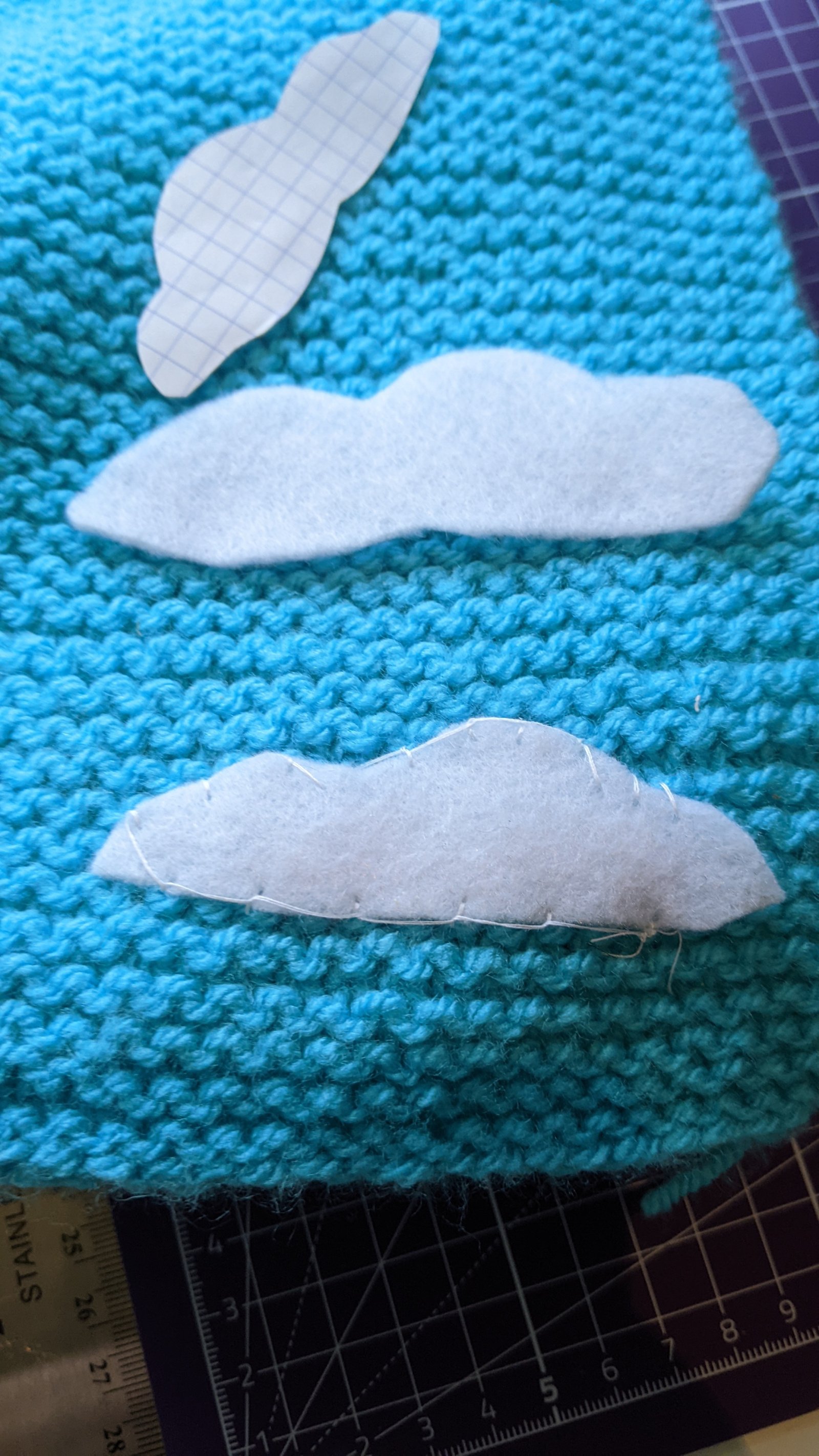 So i tried cutting out consecutively larger clouds and sewing those on to felt a larger onto. It looks a bit pants so I'd have to try and cover the stitches and I don't think they will stand up to any tugging on them (see pic).