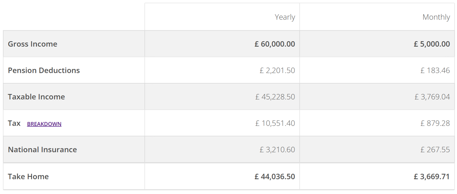 So total tax is £11432 (£7540+£3892) and total take home is £48568. Per month this is approx £4037.
