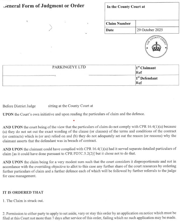Hi, I’ve not posted on here before but am very grateful for the excellent advice that has been made available (thanks to @CouponMad and @Umkomaas). I’ve had a ParkingEye PCN dating from 2020 that was passed on to DCB Legal. I ignored their letters and calls until receiving the notice from the Small Claims Court (Mar-25). I then responded and submitted the defence (Apr-25) based on the advice posted on this website followed by DQ N180 form (Jun-25) and mediation process (Jul-25) where I refused to make any payment. I received the notice the case was allocated to my local court by end of Jul-25. I subsequently had a number of attempted calls from DCB Legal but didn’t answer any. The last call was 04-Nov-25 but none since. I was expecting the next communication to be confirmation of the court hearing date. However, also on 04-Nov-25 I received the Court Judgement informing me that the ParkingEye / DCB Legal claim has been “struck out”. Based on most of the cases posted on here I was expecting to either attend a hearing or receive a Notice of Discontinuance shortly before the hearing date. Can I now assume this case is finished?