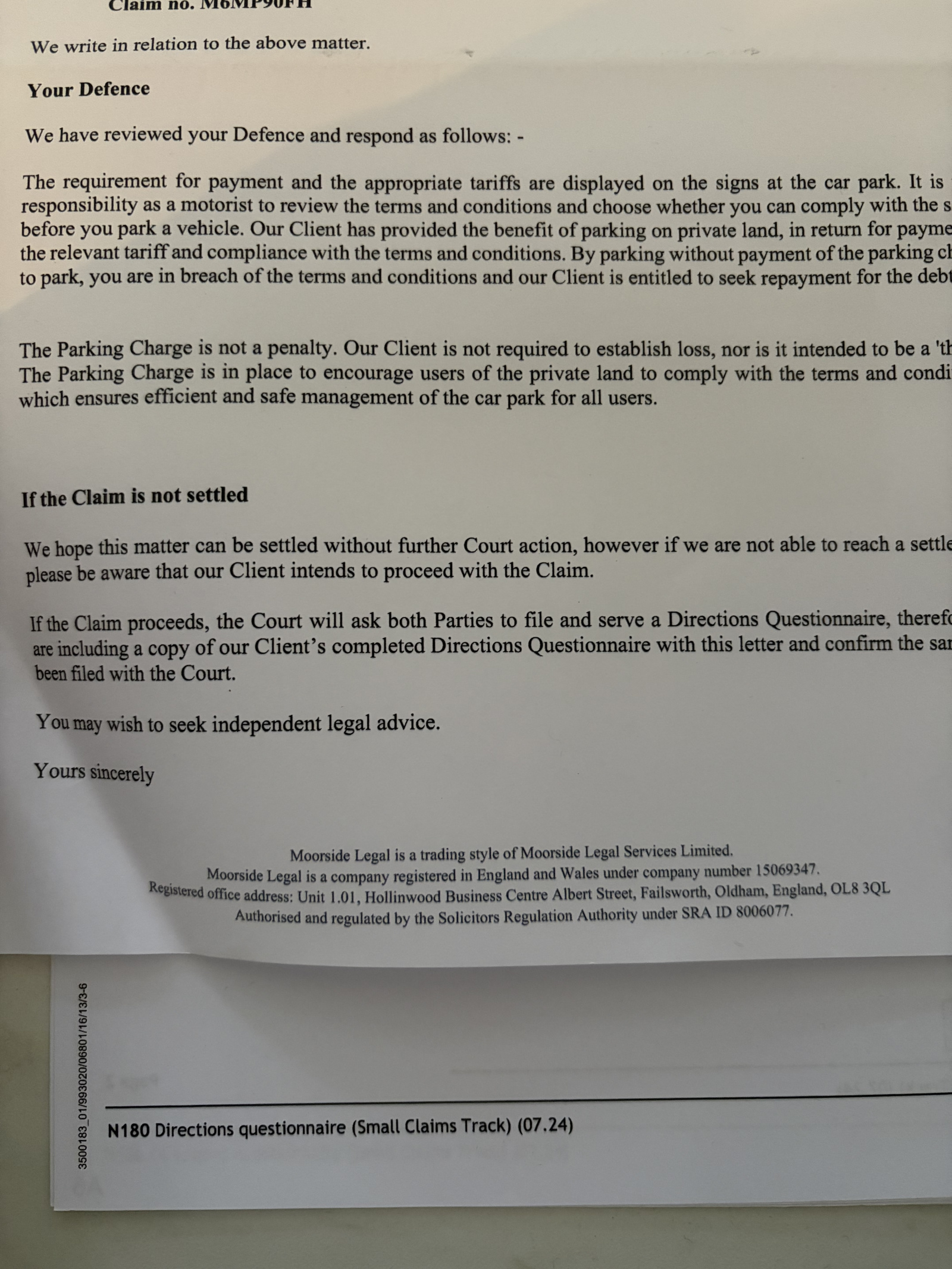 Update- recieved letter from moreside legal on 31/12/25 attached image of their response letter also included a copy of decisions questionnaire. I've not responded to them and awaited the court to send directions questionnaire which I've now recieved 20/1/26 - I have until 6th to complete and respond. Ive read the guidance in the forum I will complete questionnaire as directed by courts.