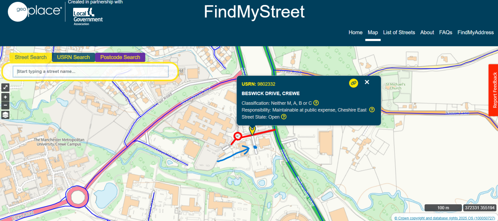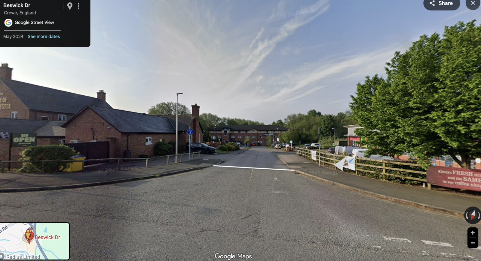 I believe, and your "Find My Street" image shows that Beswick Drive does not follow down that private road which is unadopted hence private from where the Tarmac changes, if so there should be an entrance sign where my white line is: